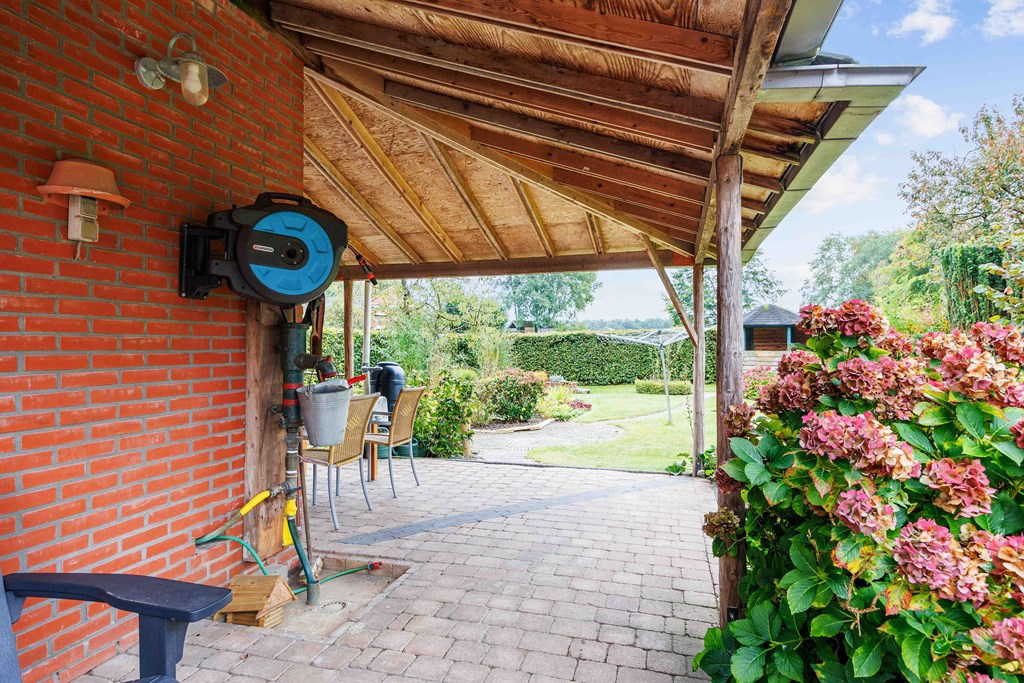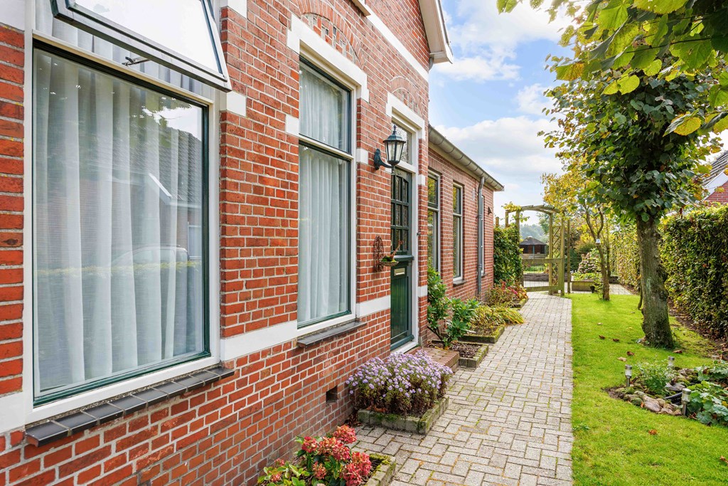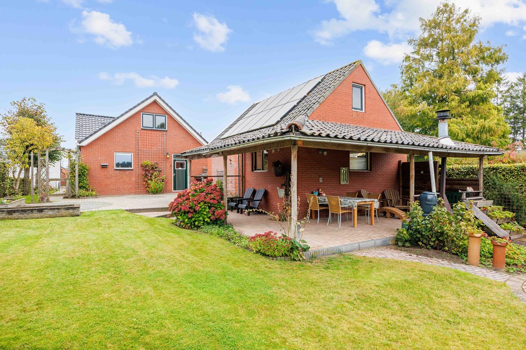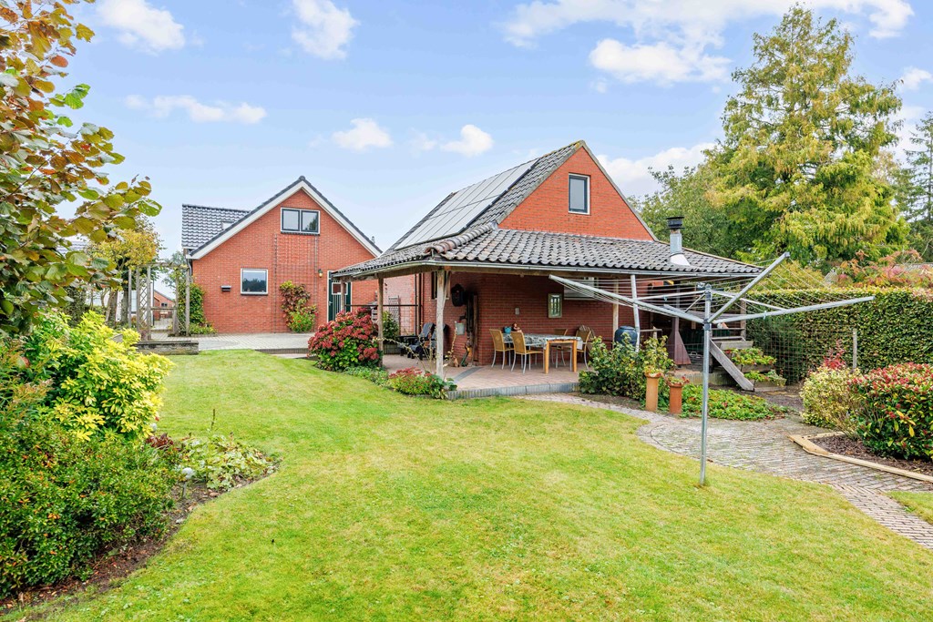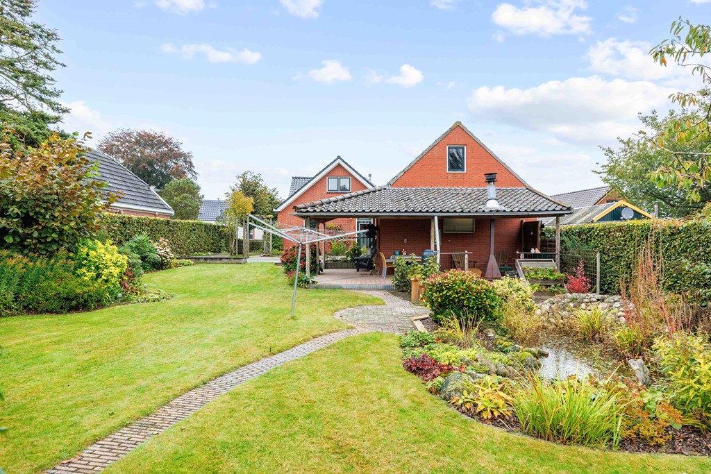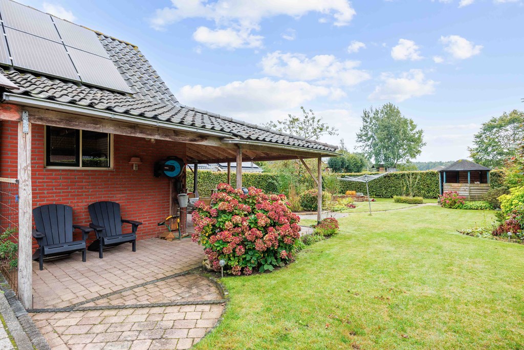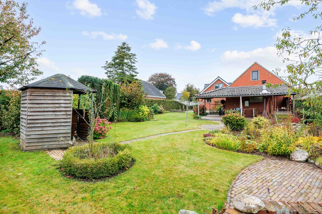 Aan de voorzijde/zijkant is er een siertuin met sierhek, met een gazon en borders en voetpad naar de voordeur. Aan de linkerzijkant is een oprit naar de garage/schuur, voorts een afscheidingssloot. Achter de woning: een groot terras, een overkapping gehecht aan de schuur/garage (zuid en west). Achter het terras een groot gazon met borders, terras en kleine vijver, omzoomd met beukenhagen. De groene tuin geeft u in het voorjaar, zomer en herfst mooie, momenten om te genieten van rust en ruimte.