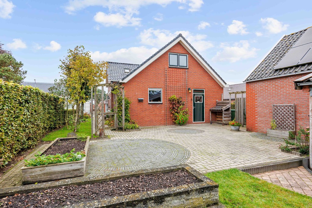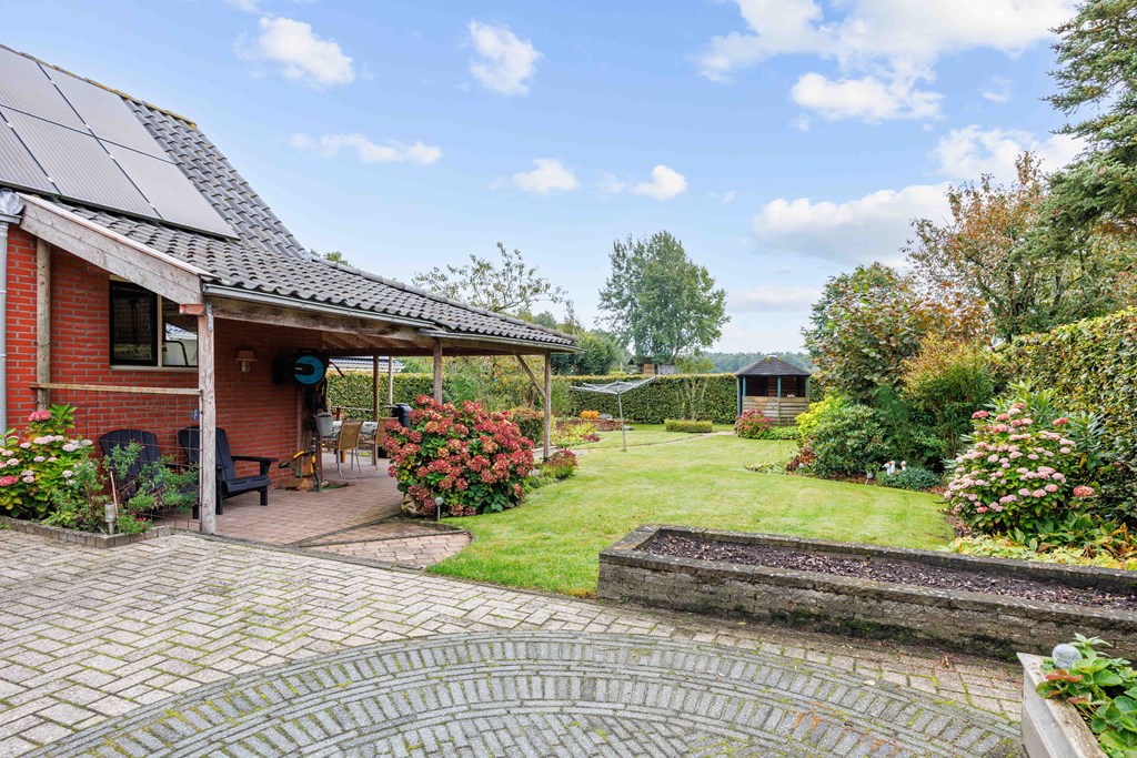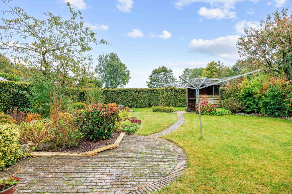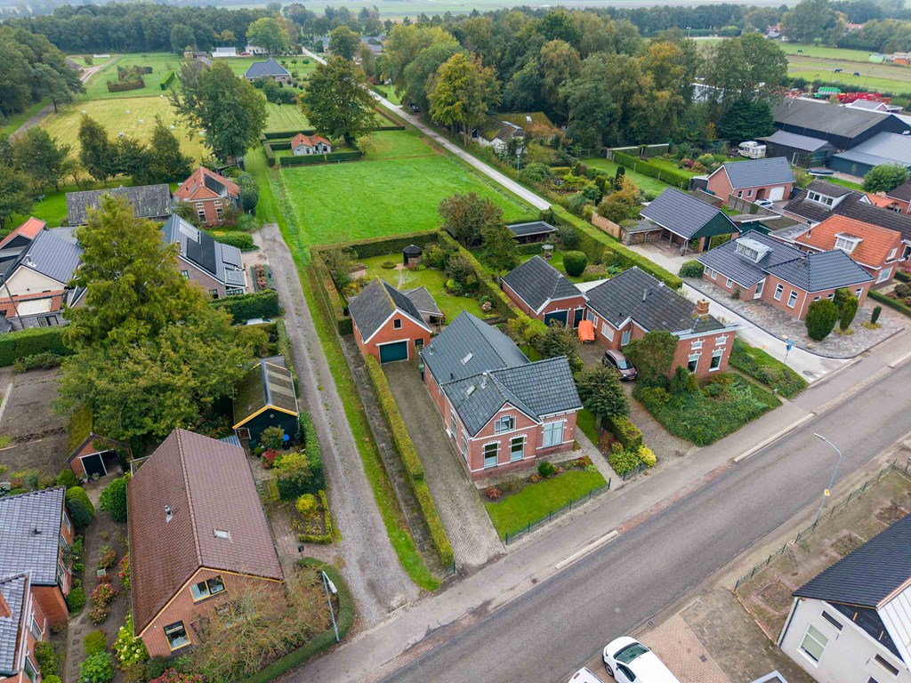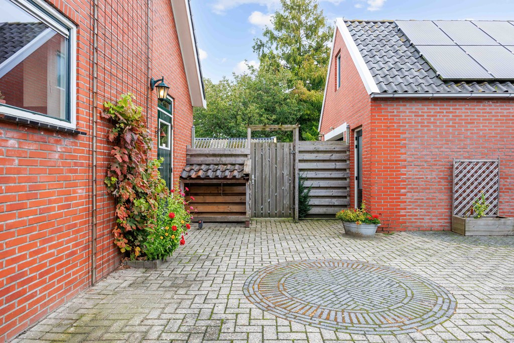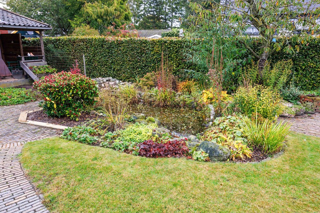Aan de voorzijde/zijkant is er een siertuin met sierhek, met een gazon en borders en voetpad naar de voordeur. Aan de linkerzijkant is een oprit naar de garage/schuur, voorts een afscheidingssloot. Achter de woning: een groot terras, een overkapping gehecht aan de schuur/garage (zuid en west). Achter het terras een groot gazon met borders, terras en kleine vijver, omzoomd met beukenhagen. De groene tuin geeft u in het voorjaar, zomer en herfst mooie, momenten om te genieten van rust en ruimte.