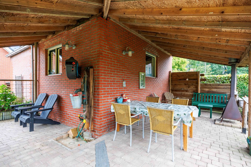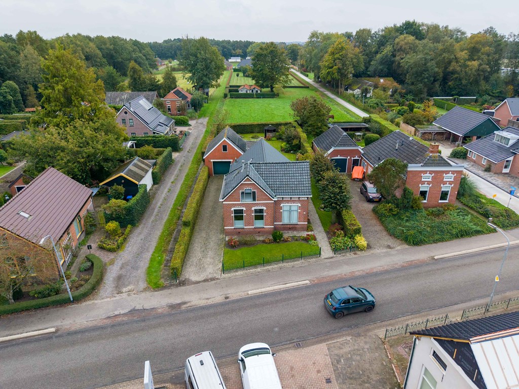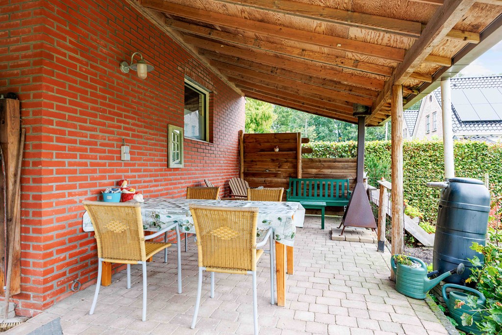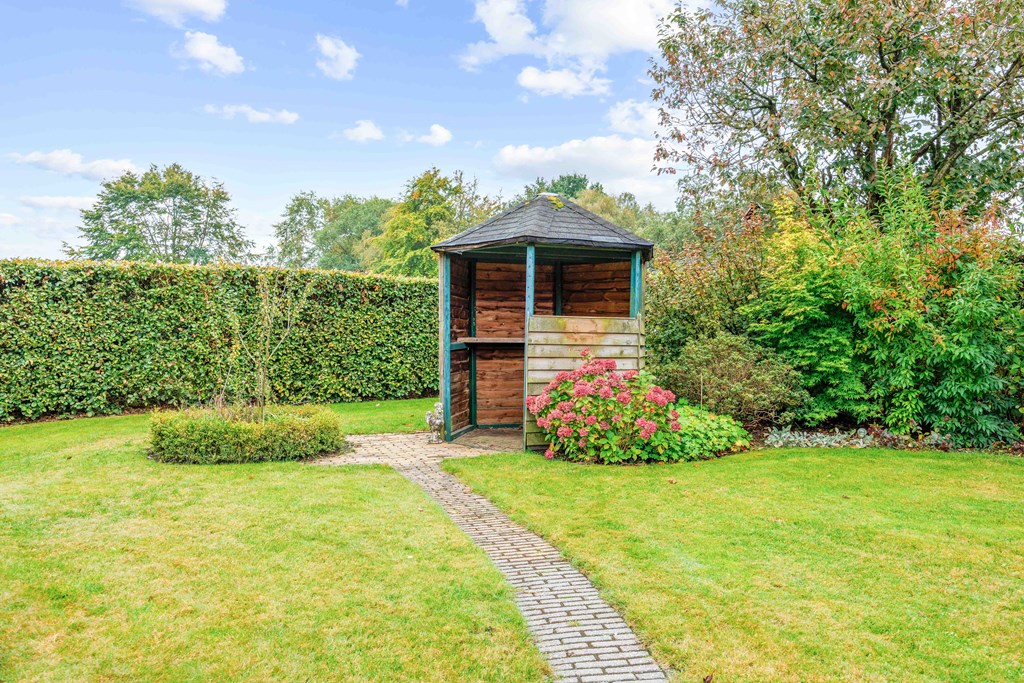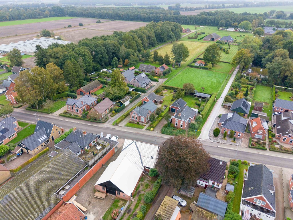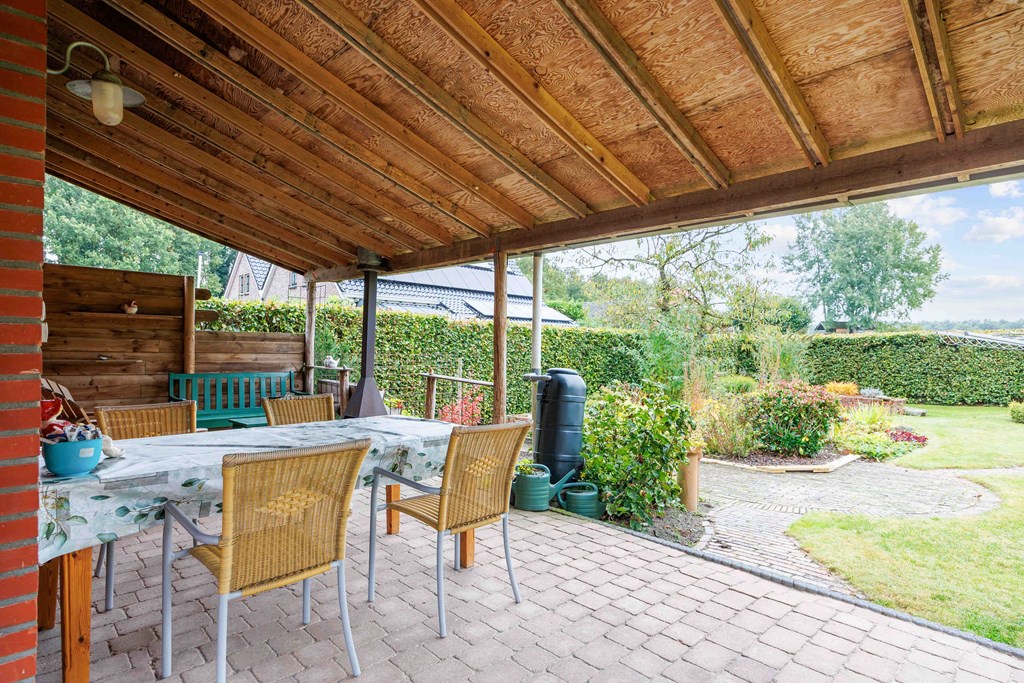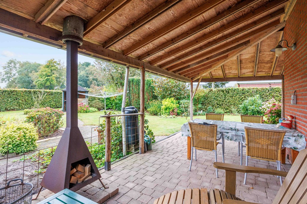 Aan de voorzijde/zijkant is er een siertuin met sierhek, met een gazon en borders en voetpad naar de voordeur. Aan de linkerzijkant is een oprit naar de garage/schuur, voorts een afscheidingssloot. Achter de woning: een groot terras, een overkapping gehecht aan de schuur/garage (zuid en west). Achter het terras een groot gazon met borders, terras en kleine vijver, omzoomd met beukenhagen. De groene tuin geeft u in het voorjaar, zomer en herfst mooie, momenten om te genieten van rust en ruimte.