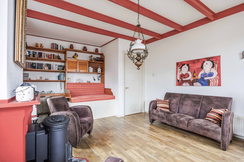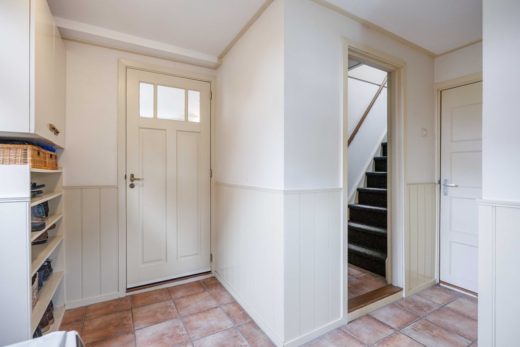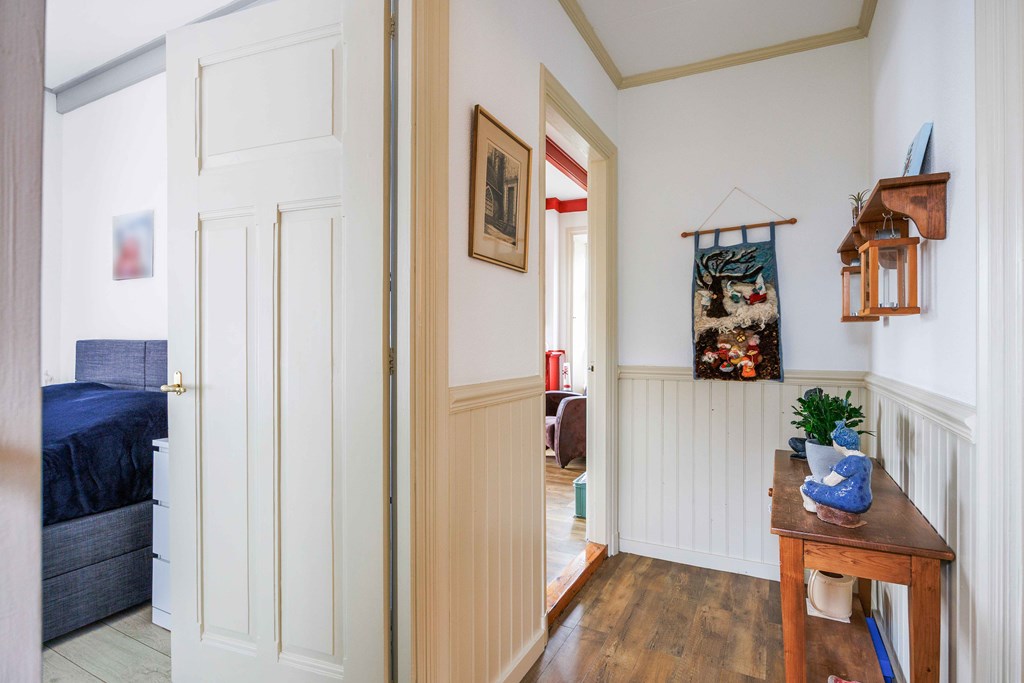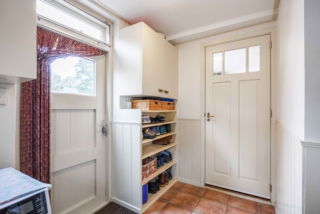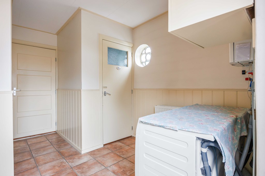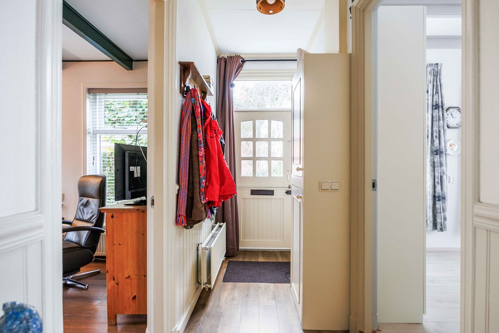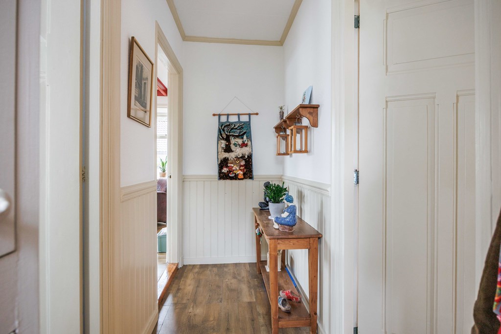 Entree/hal; vanuit de hal/gang toegang tot de woonkamer. woonkeuken en slaapkamer met fraaie paneeldeuren; de hal/gang is voorzien van lambrisering en een laminaatvloer. In de hal bevindt zich de meterkast (8x230V). De woonkamer met laminaatvloer, blinden voor de ramen, schoorsteenmantel met sfeerhaard en met de balken in het zicht, is ruim en authentiek. Ook aan de voorzijde is er een ruime slaapkamer. De woonkeuken en eetkamer heeft naast de keukenopstelling een kelder en een trapkast. De droge kelder heeft een stenen trap en heeft authentieke plavuizen. De keuken is voorzien van een magnetron, een oven, een vaatwasser, een koeler en heeft een inductiekooplaat met afzuiging. De keuken heeft een hoekopstelling. De achterhal/bijkeuken/garderobe heeft een plavuizenvloer; hier is de opstelling van de CV installatie (Remeha Avanta) en ook zijn hier de witgoed aansluitingen voor de wasmachine en droger. Vanuit de hal is er toegang tot het toilet met wandcloset en fontein en toegang tot de badkamer met douchehoek, design radiator en vaste wastafelmeubel. In de badkamer en de bijkeuken zijn nog stalraampjes verwerkt.