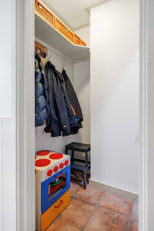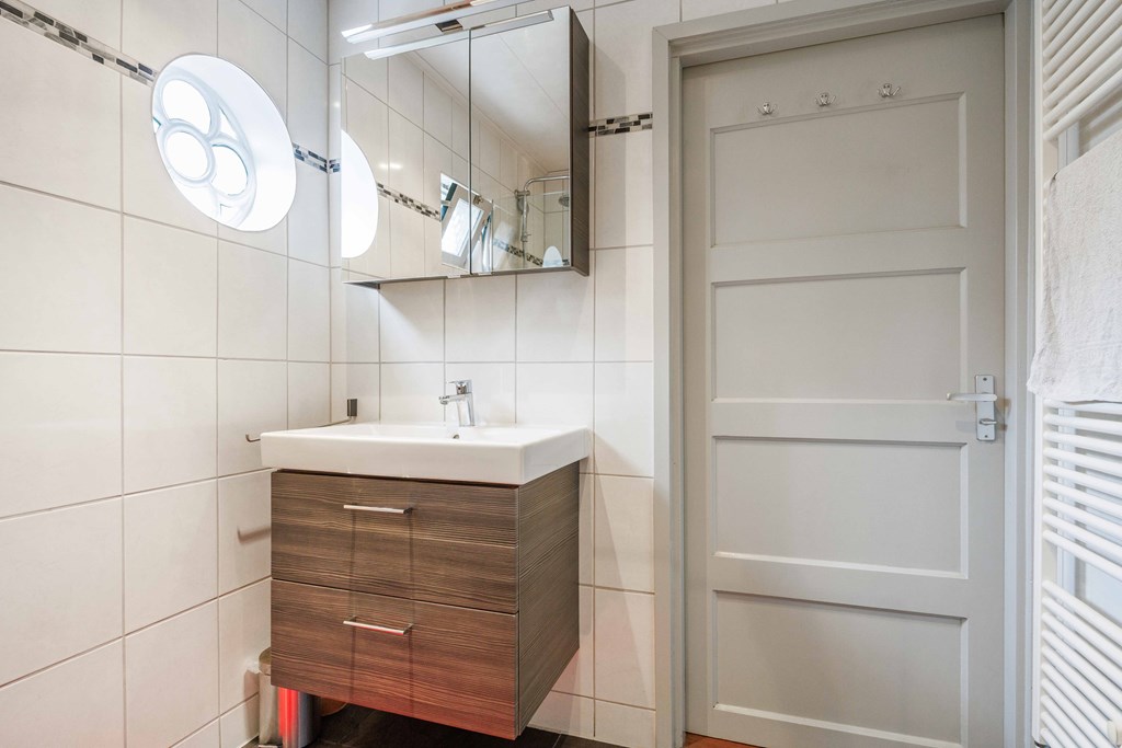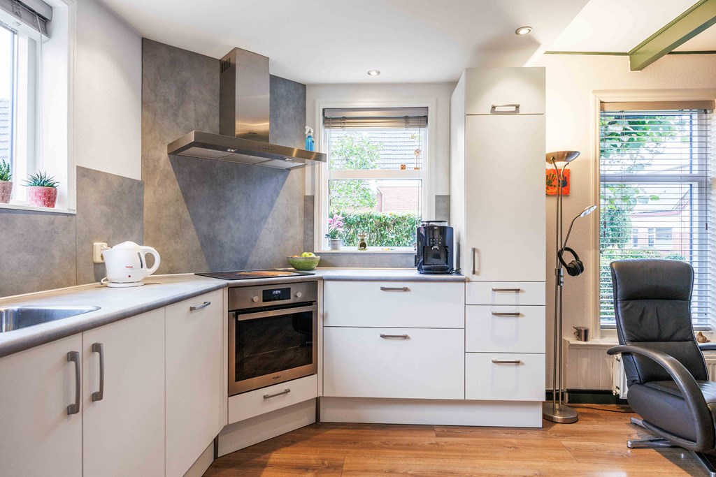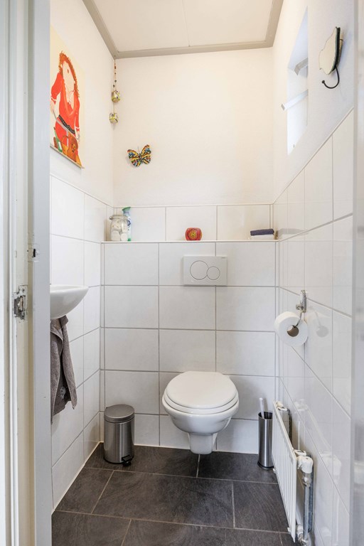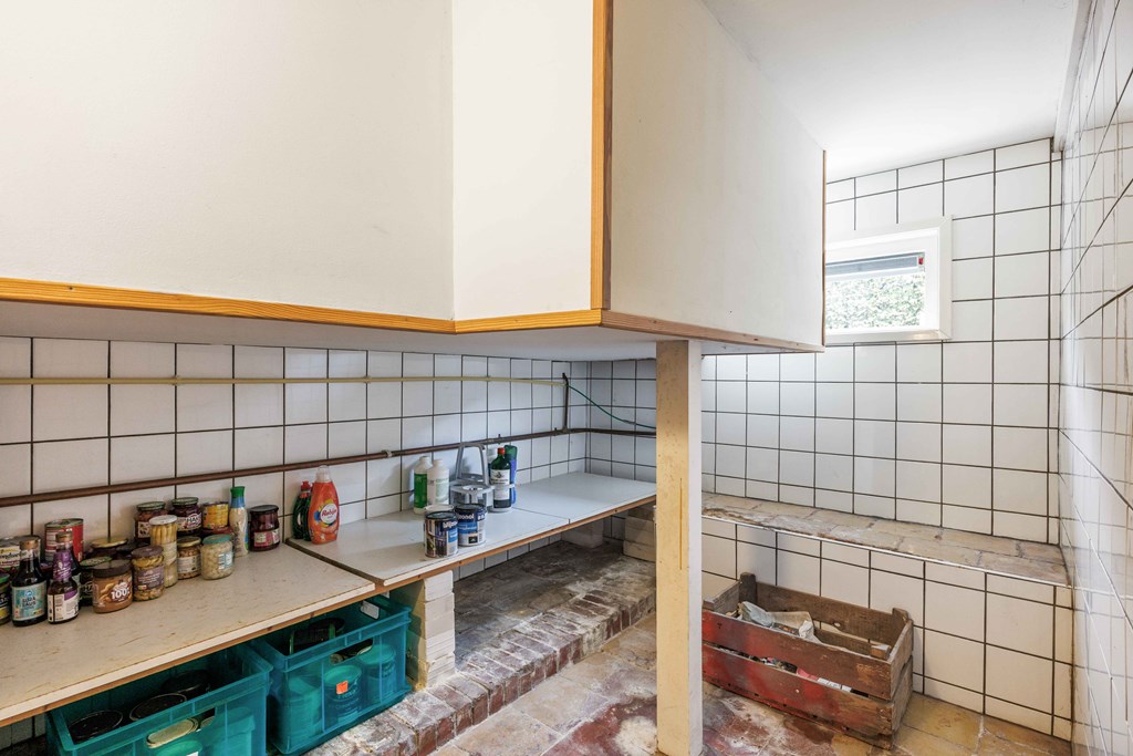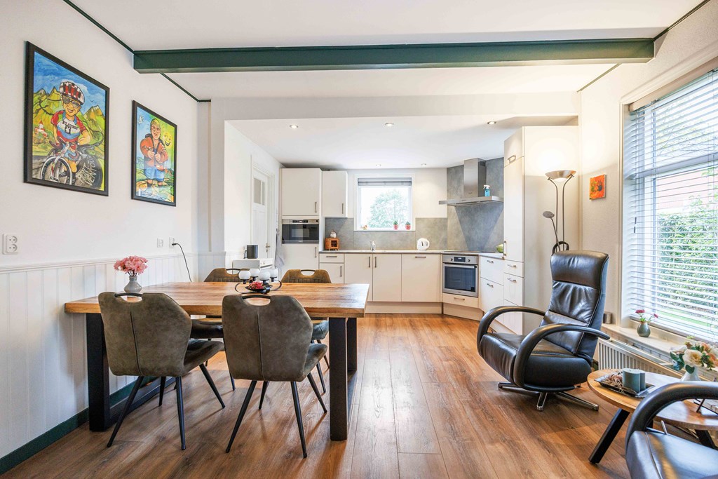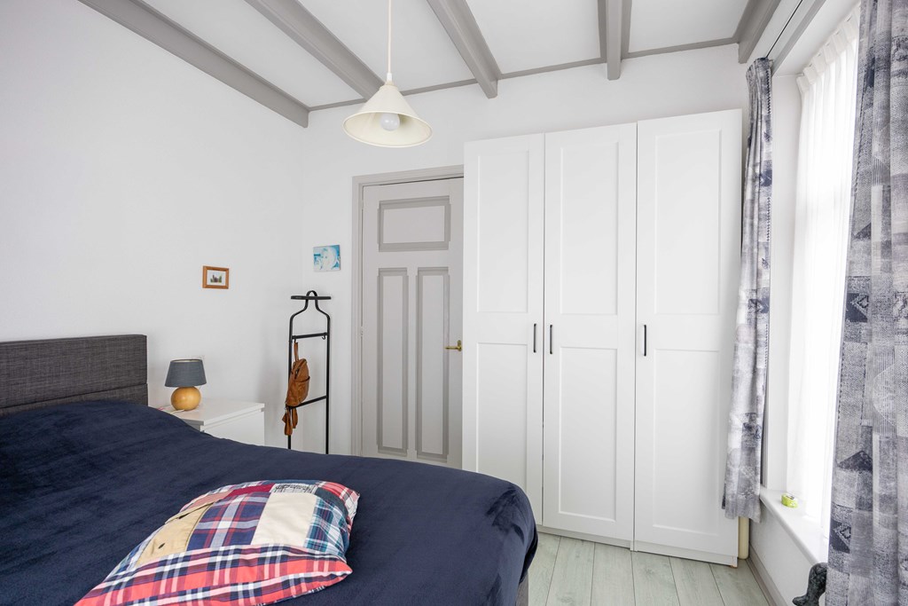 Entree/hal; vanuit de hal/gang toegang tot de woonkamer. woonkeuken en slaapkamer met fraaie paneeldeuren; de hal/gang is voorzien van lambrisering en een laminaatvloer. In de hal bevindt zich de meterkast (8x230V). De woonkamer met laminaatvloer, blinden voor de ramen, schoorsteenmantel met sfeerhaard en met de balken in het zicht, is ruim en authentiek. Ook aan de voorzijde is er een ruime slaapkamer. De woonkeuken en eetkamer heeft naast de keukenopstelling een kelder en een trapkast. De droge kelder heeft een stenen trap en heeft authentieke plavuizen. De keuken is voorzien van een magnetron, een oven, een vaatwasser, een koeler en heeft een inductiekooplaat met afzuiging. De keuken heeft een hoekopstelling. De achterhal/bijkeuken/garderobe heeft een plavuizenvloer; hier is de opstelling van de CV installatie (Remeha Avanta) en ook zijn hier de witgoed aansluitingen voor de wasmachine en droger. Vanuit de hal is er toegang tot het toilet met wandcloset en fontein en toegang tot de badkamer met douchehoek, design radiator en vaste wastafelmeubel. In de badkamer en de bijkeuken zijn nog stalraampjes verwerkt.