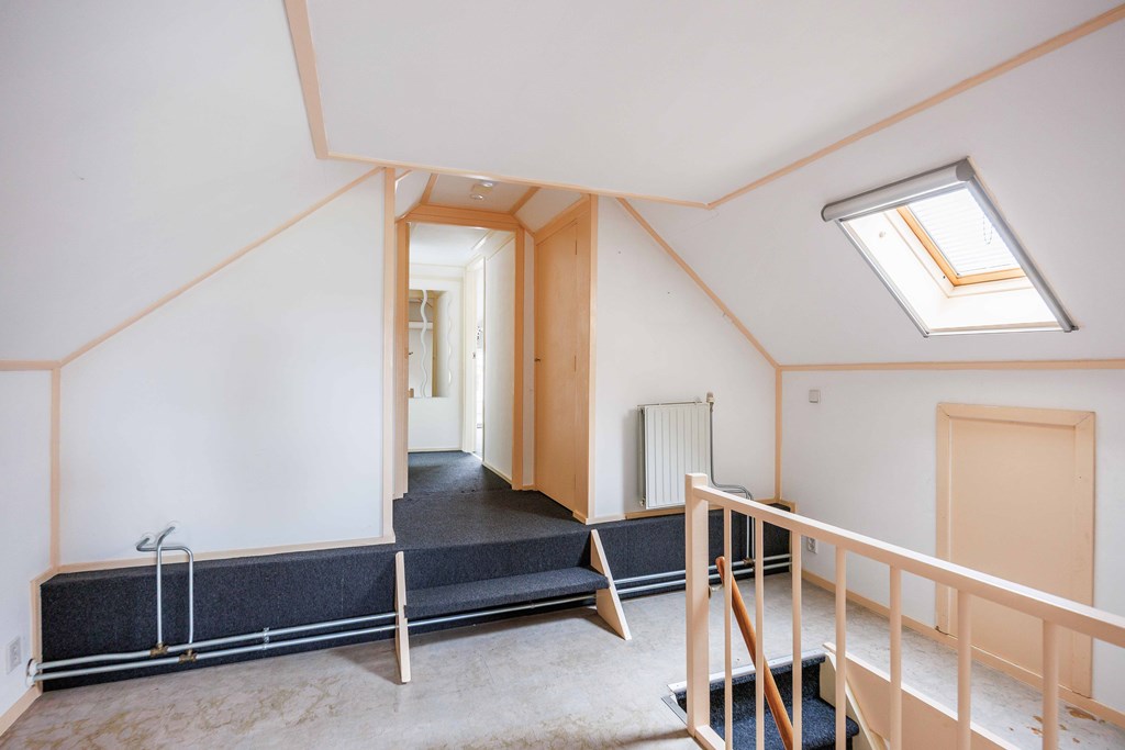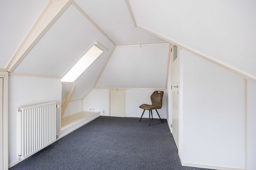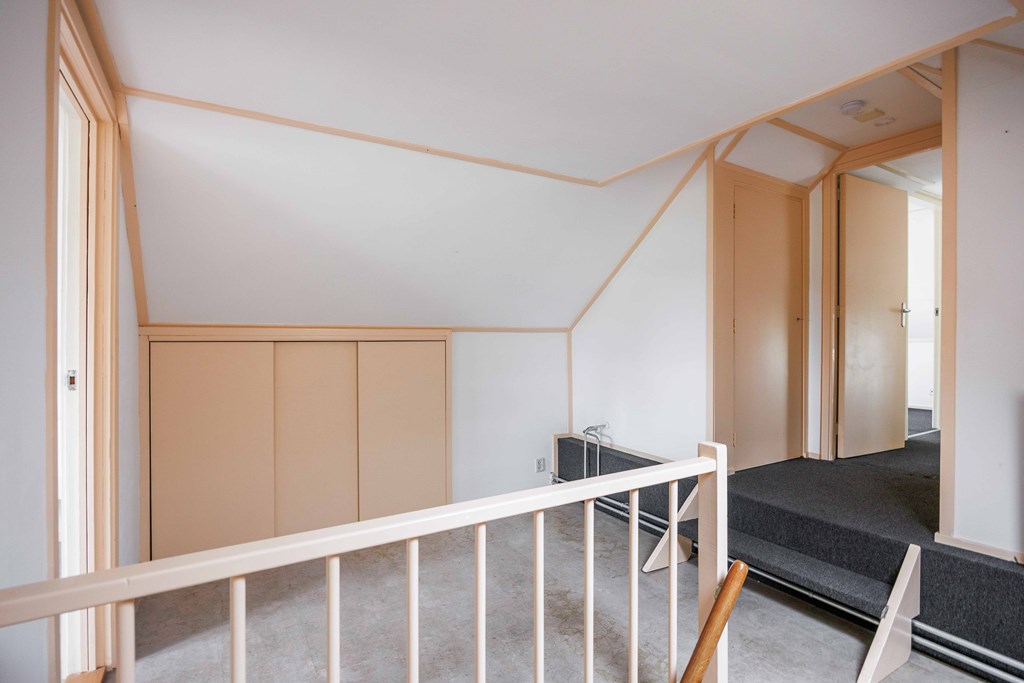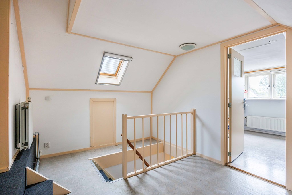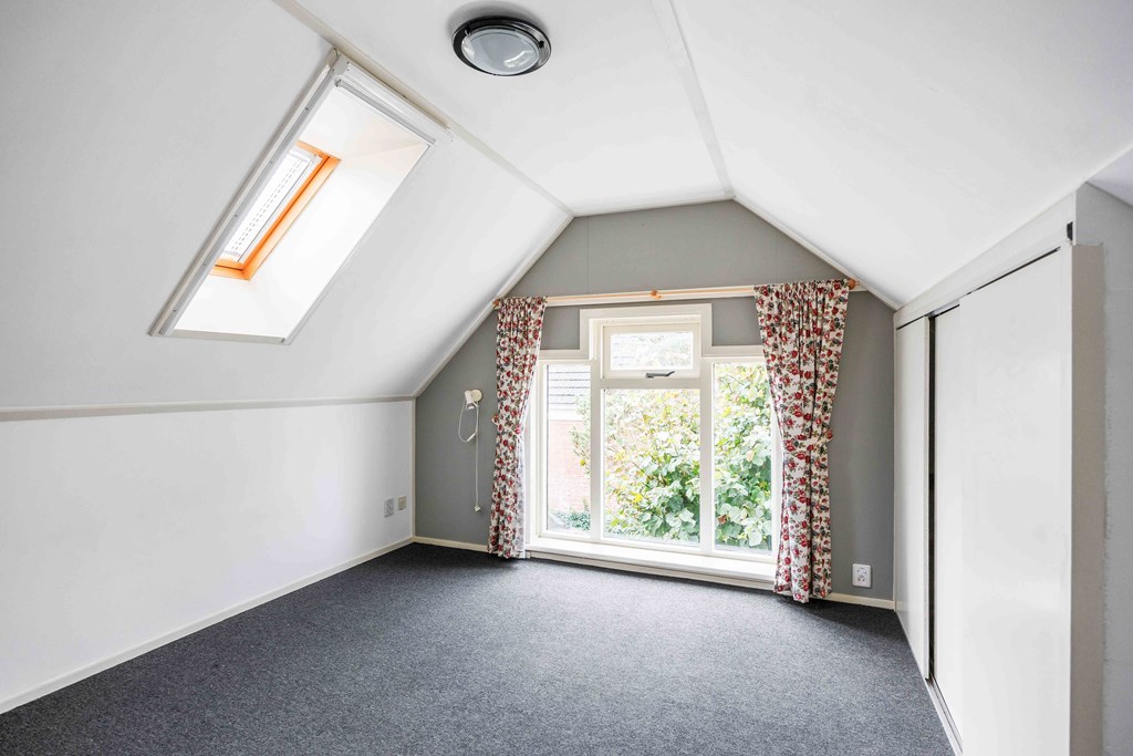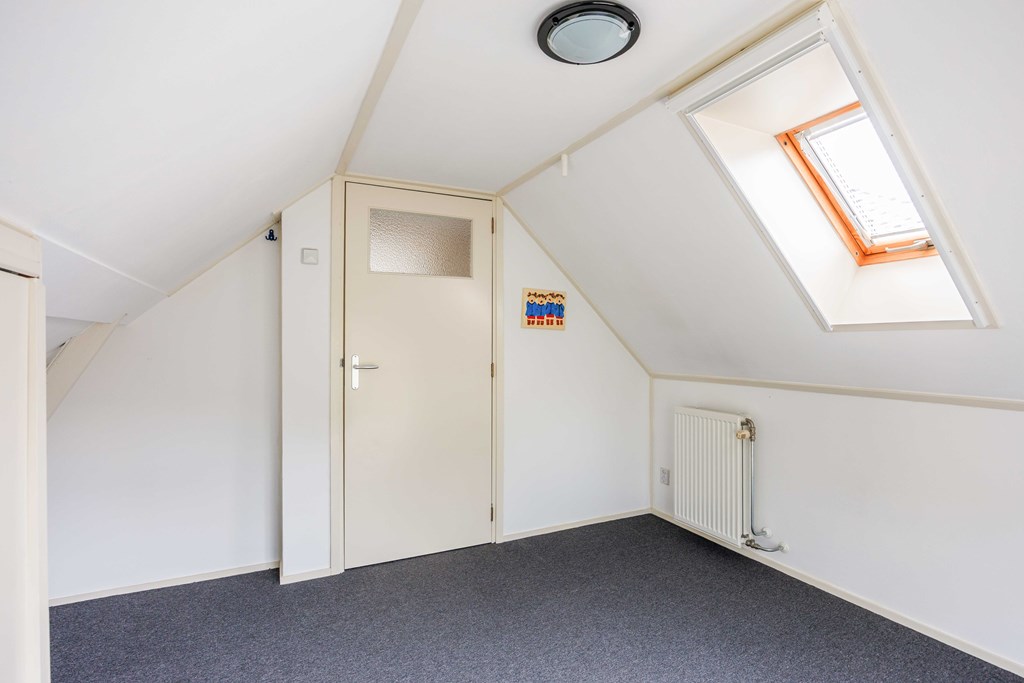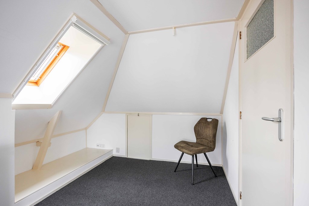 Vanuit de achter hal, met de achter toegangsdeur, is middels een vaste, rechte en gesloten trap toegang tot de verdieping. De overloop met een kurkenvloer is groot en ruim, heeft een dakraam en is voorzien van bergruimtes door middel van knieschotten, tevens zijn er op de overloop twee vaste kasten. Aan berg-, en kastruimte dus geen gebrek. Aan de voorzijde zijn twee slaapkamers, eveneens met knieschotten en voorzien van vloerbedekking. Deze slaapkamers zijn voorzien van ramen en dakramen. Aan de achterzijde is een grote slaapkamer met kurkenvloer met ook bergruimte.