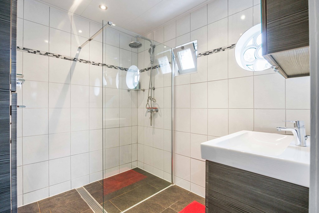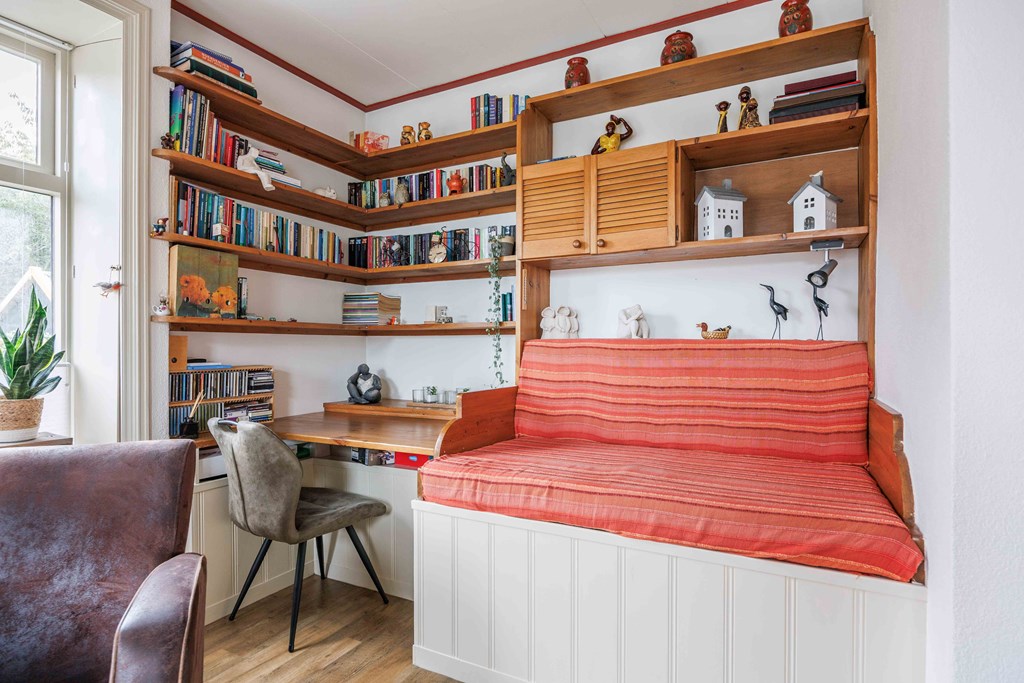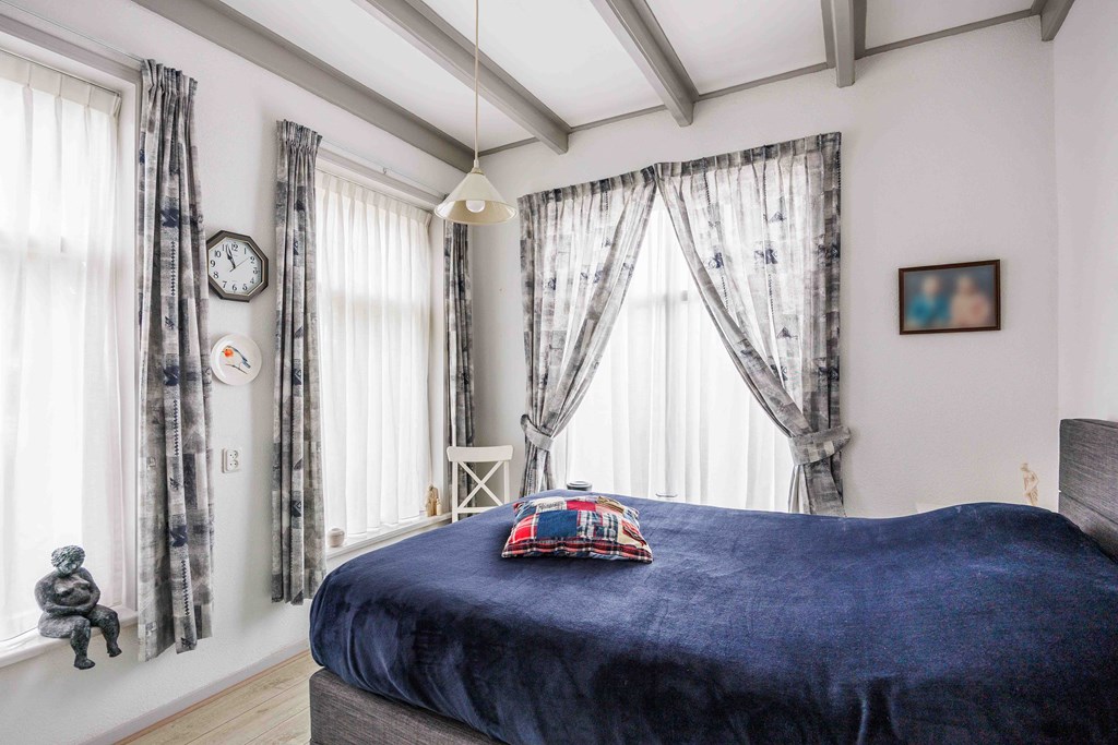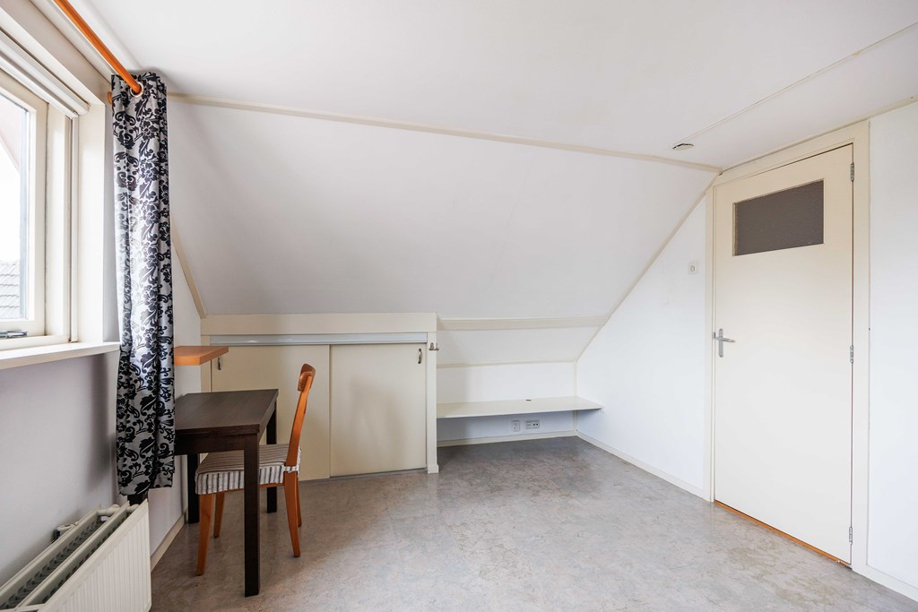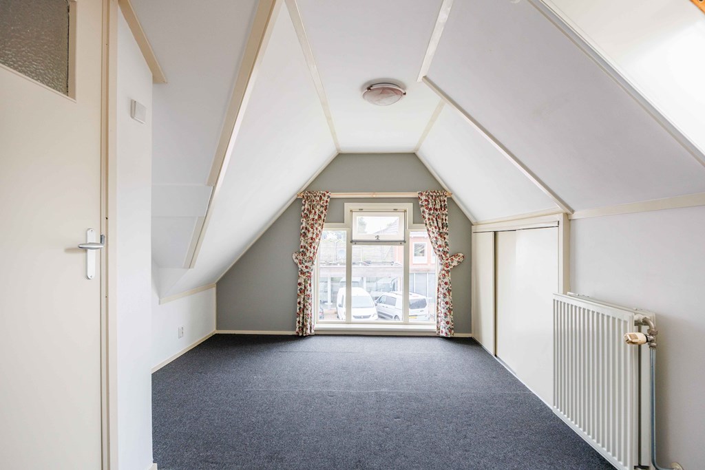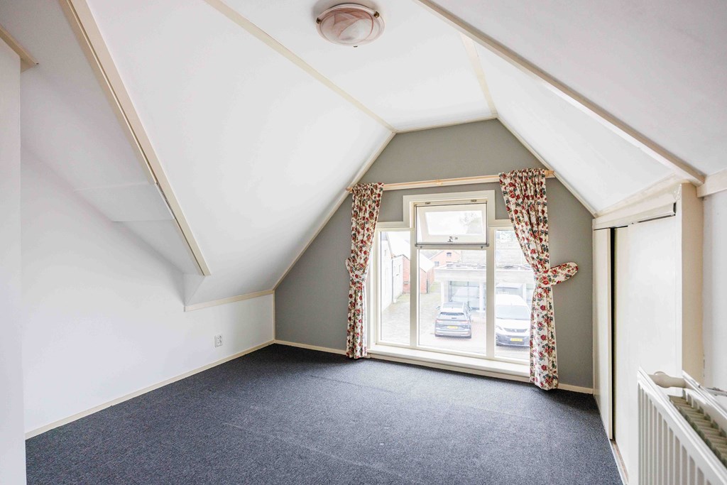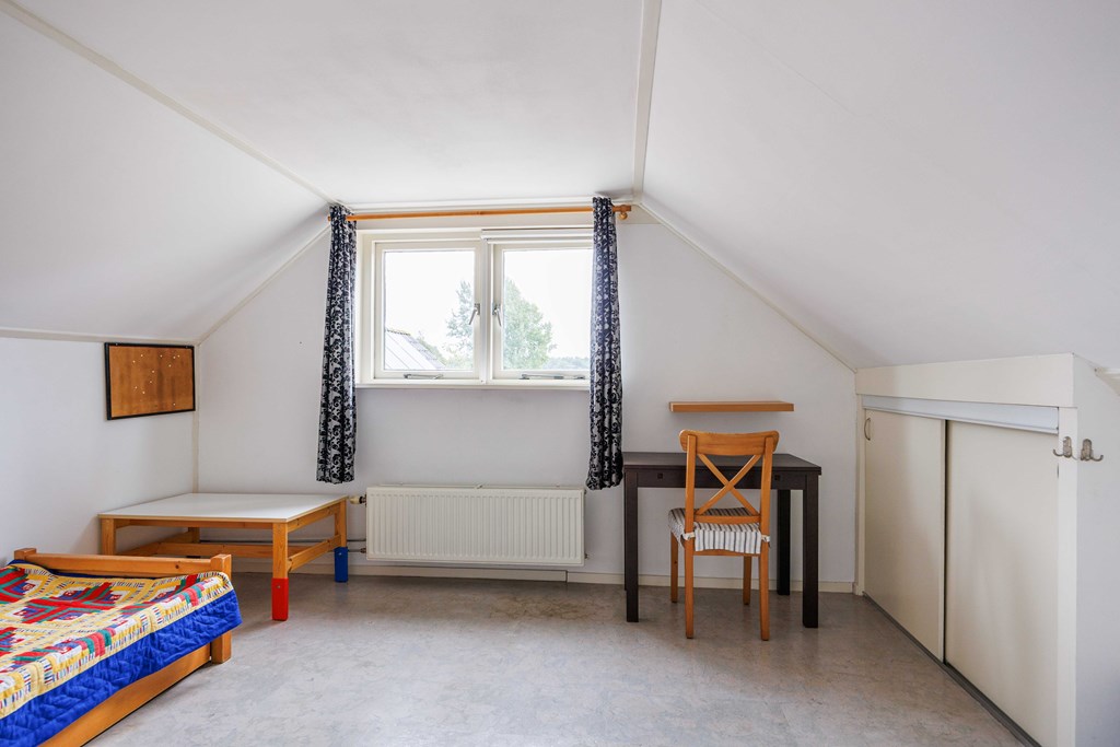 Vanuit de achter hal, met de achter toegangsdeur, is middels een vaste, rechte en gesloten trap toegang tot de verdieping. De overloop met een kurkenvloer is groot en ruim, heeft een dakraam en is voorzien van bergruimtes door middel van knieschotten, tevens zijn er op de overloop twee vaste kasten. Aan berg-, en kastruimte dus geen gebrek. Aan de voorzijde zijn twee slaapkamers, eveneens met knieschotten en voorzien van vloerbedekking. Deze slaapkamers zijn voorzien van ramen en dakramen. Aan de achterzijde is een grote slaapkamer met kurkenvloer met ook bergruimte.