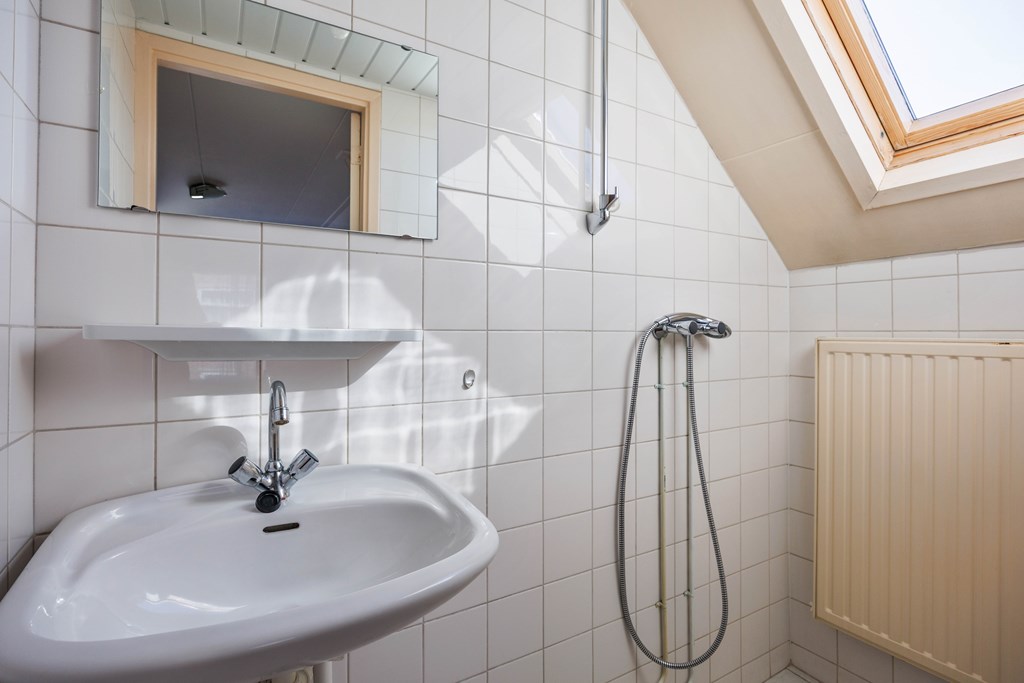Middels vaste rechte trap toegang tot de verdieping met overloop met dakraam, twee slaapkamers met vaste kasten en een kleine badkamer met douche en vaste wastafel en ook voorzien van een dakraam. Op de verdieping zijn het betonvloeren.