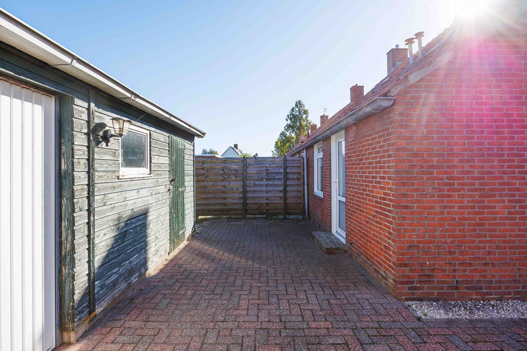 Aan de voorzijde en achterzijde zijn gazons. Een brede oprit naar de garage. De achtertuin is voorzien van schuttingen met de buren en aan de achterzijde is er een greppel.