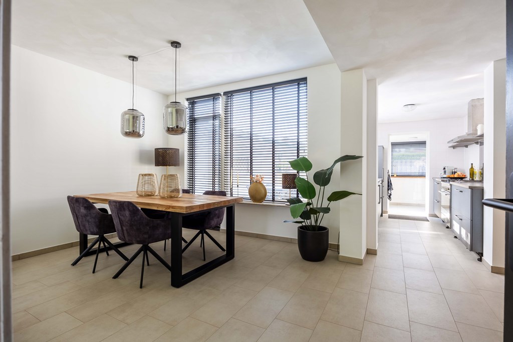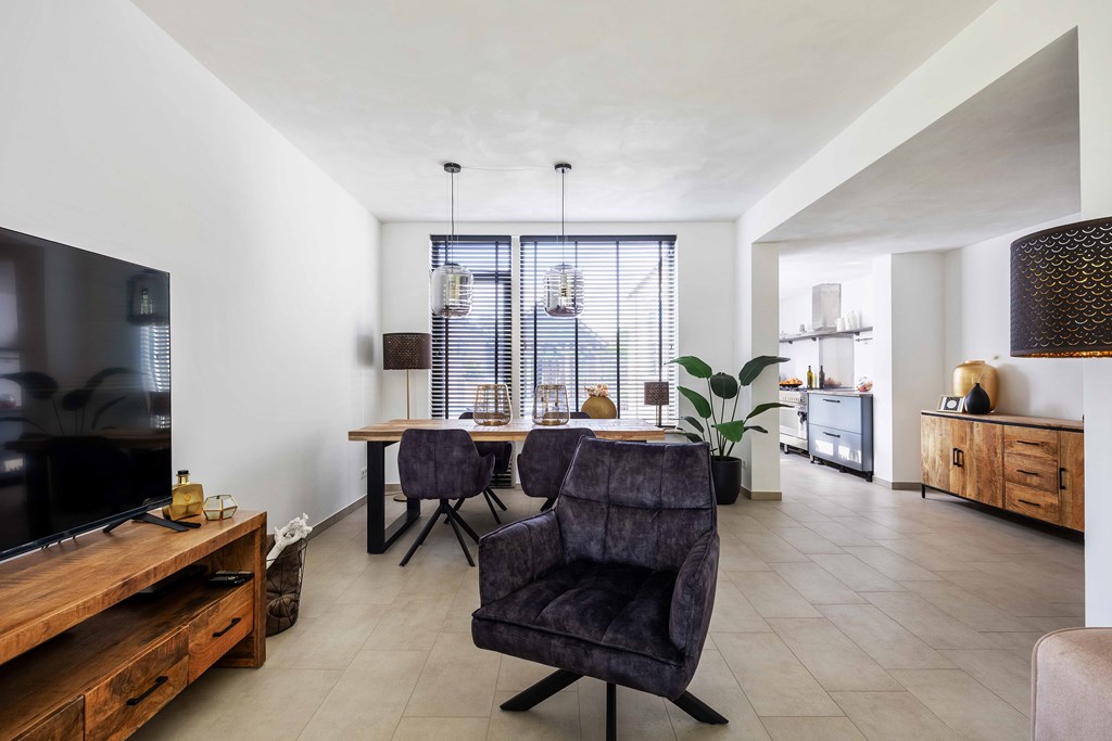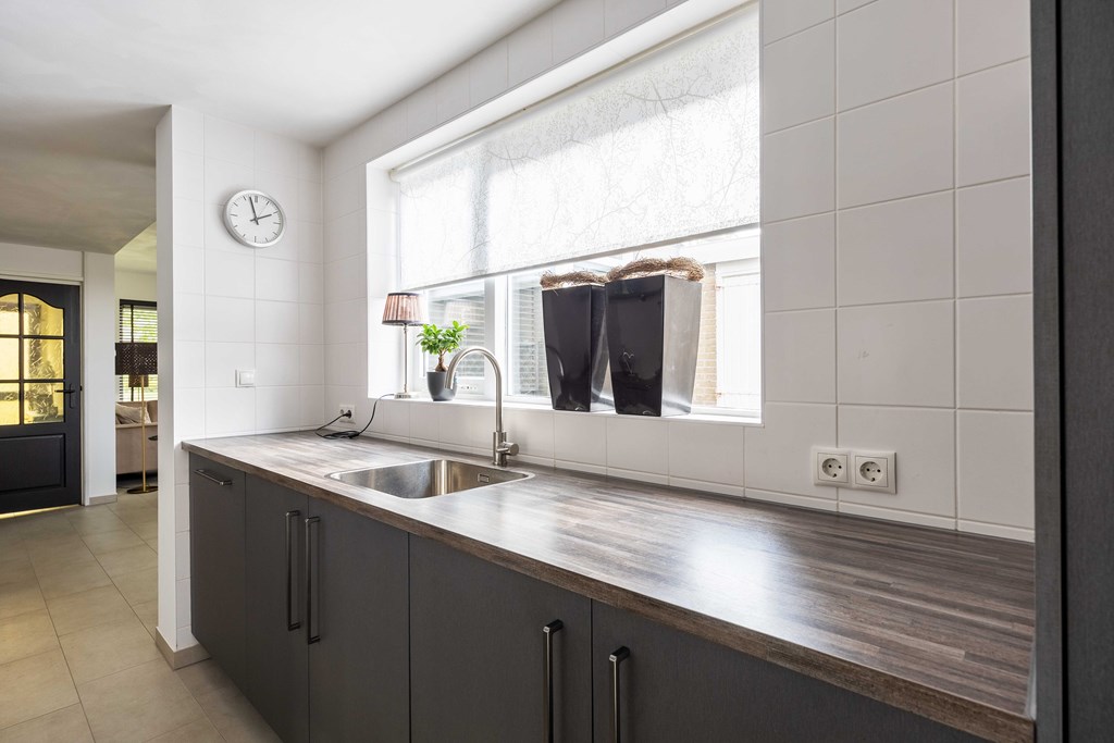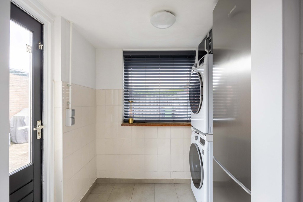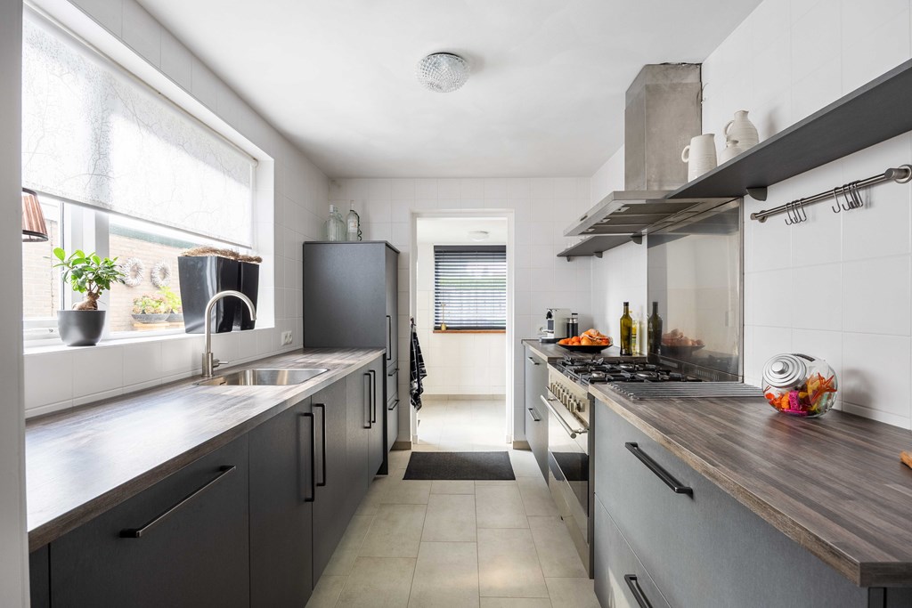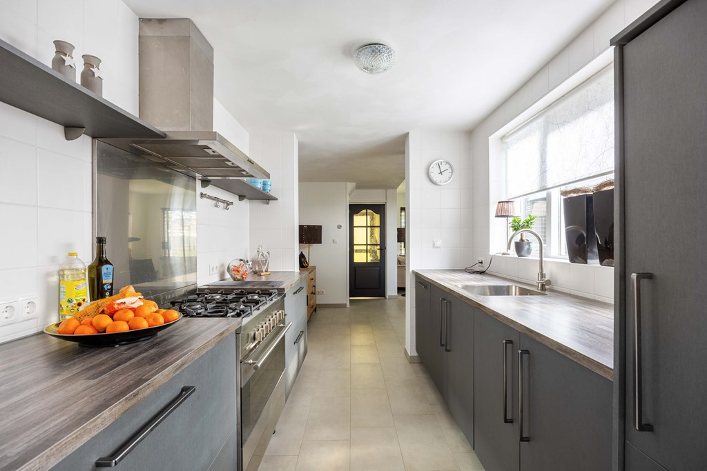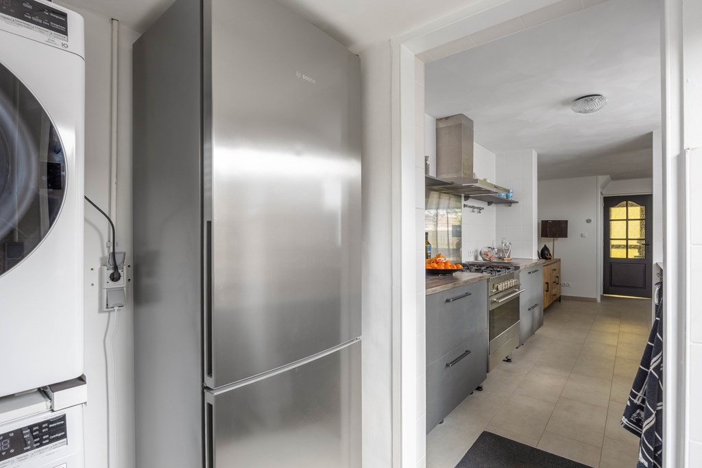 Binnenkomst – Licht, ruimte en een warm welkom Stap binnen via de hal waar meteen opvalt hoe netjes en verzorgd alles is. Hier vind je niet alleen de meterkast, maar ook de trapopgang naar. De toiletruimte is voorzien van een modern wandcloset en fonteintje. L-vormige woonkamer – Jouw centrale ontmoetingsplek Ben jij van het type dat houdt van lekker lang natafelen met vrienden of met de kids op de bank een filmavondje? Dan doet de ruime, lichte L-vormige woonkamer jouw hart vast sneller kloppen. Dankzij de grote raampartijen komt het daglicht hier overvloedig binnen, en de terrasdeur zorgt ervoor dat je ’s zomers zo het frisse buiten naar binnen haalt. Altijd al gedroomd van een plek waar geleefd mag worden? Check! Moderne keuken – Koken wordt een feestje De halfopen keuken is helemaal van nu en heeft door de dubbele opstelling lekker veel werkruimte. Bereid met gemak de lekkerste maaltijden, want aan apparatuur geen gebrek: een vaatwasser, fornuis met afzuiging, koelkast en zelfs een aparte boiler staan voor je klaar. Echte thuiskoks kunnen hier hun geluk niet op, terwijl je dankzij het halfopen karakter altijd in contact blijft met de woonkamer. Praktische bijkeuken – Was doen was nog nooit zo makkelijk Aansluitend aan de keuken ligt de royale bijkeuken. Dankzij de witgoedaansluiting kun je hier fijn je was draaien en eventueel extra voorraad kwijt. De achterentree maakt deze ruimte bovendien ideaal voor natte laarzen, sportspullen of vieze hondenpootjes. Handig toch?