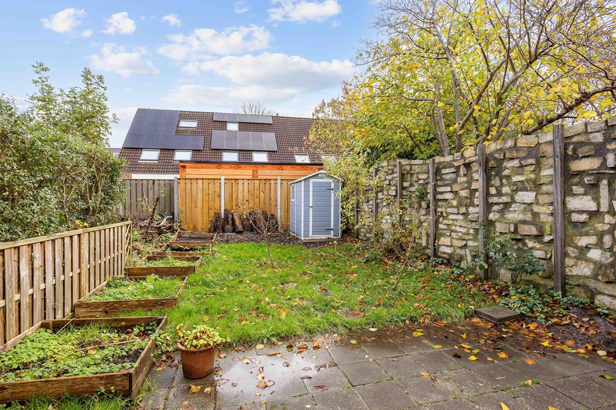 Niet alleen binnen is het in de woning goed vertoeven ook buiten. De achtertuin is gelegen op het oosten en beschikt over een terras, gazon en een praktisch tuinhuisje waarin je genoeg ruimte hebt voor je tuingereedschap, grasmaaier en zelfs de barbecue. Aan de voorzijde van de woning staat een stenen berging welke zich uitstekend leent voor het stallen van je fiets.