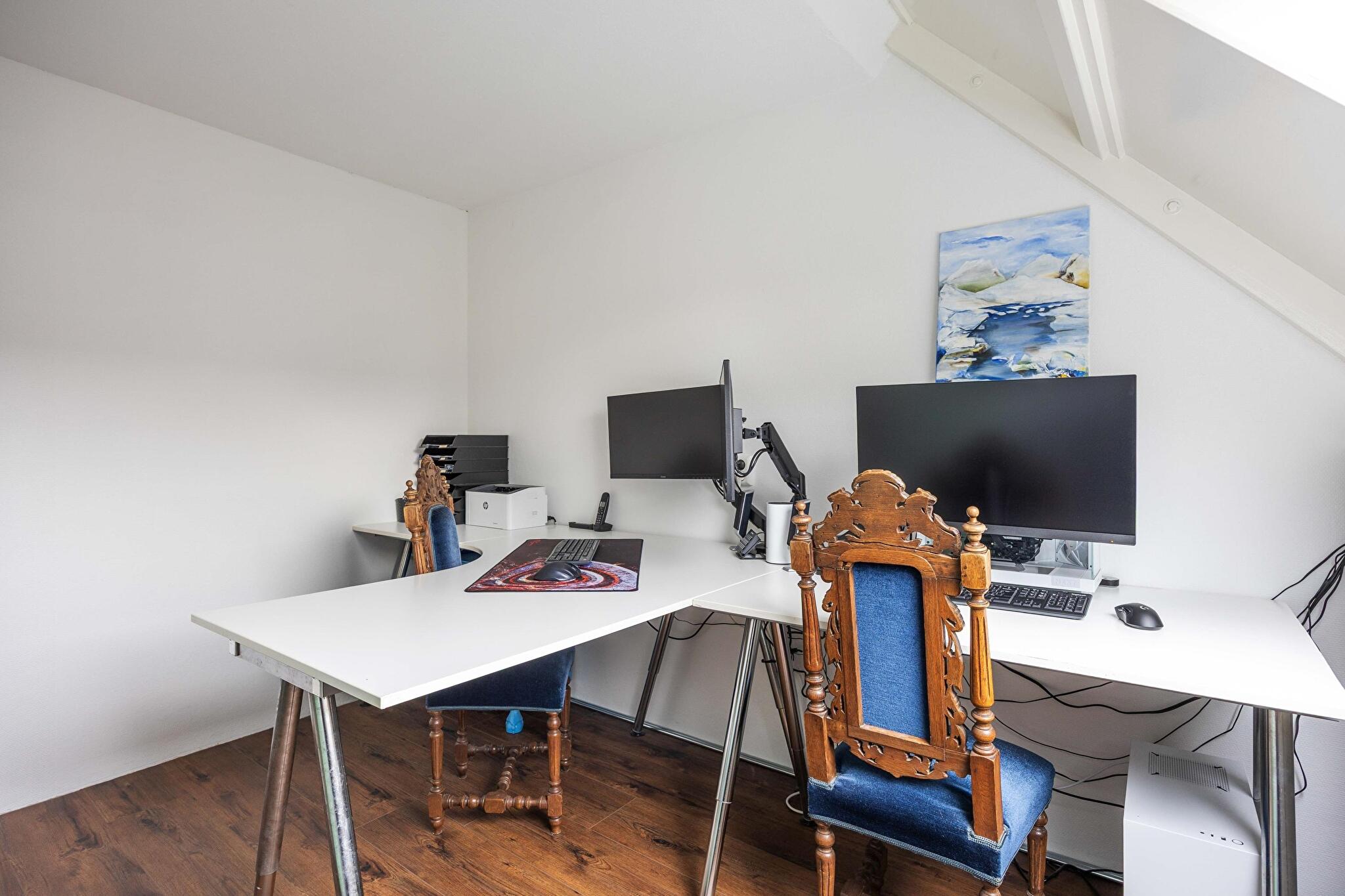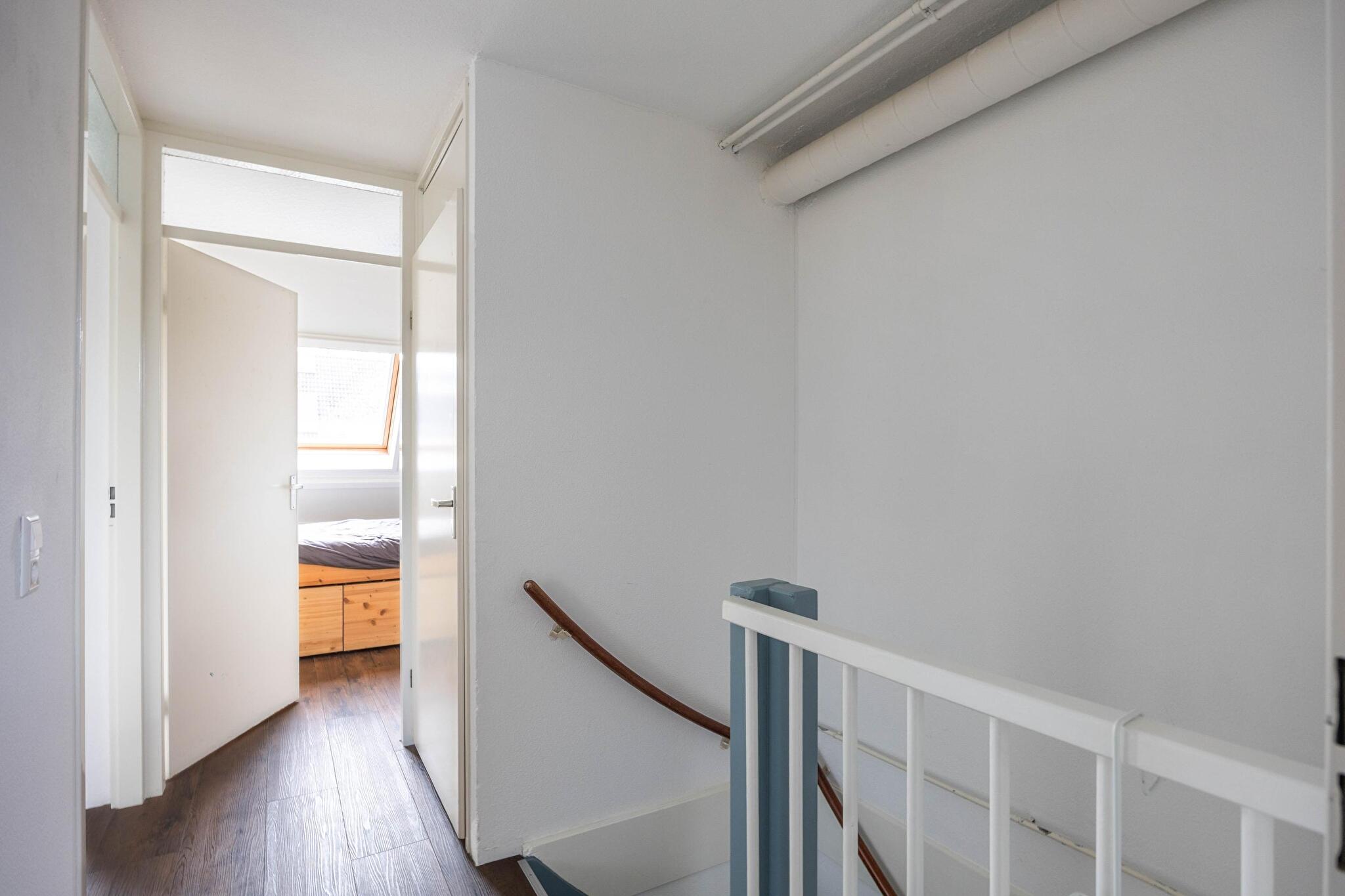 Overloop met toegang tot drie slaapkamers; aan de voorzijde de grootste slaapkamer, aan de achterzijde twee slaapkamers elke met een dakraam. Verder vind je op de eerste verdieping de badkamer voorzien van douche, wastafel en wasmachine aansluiting. Ook is er op de verdieping een bergkast met cv-opstelplaats en mechanische ventilatie box.