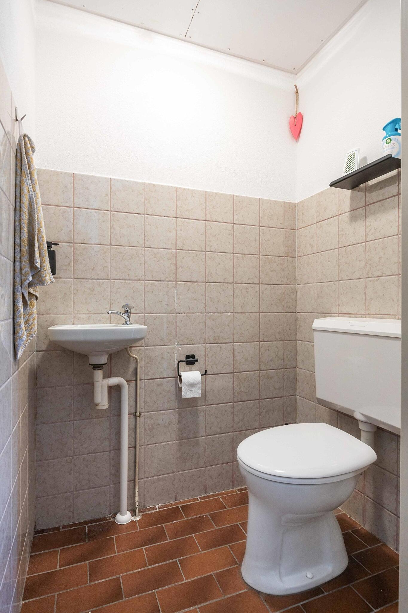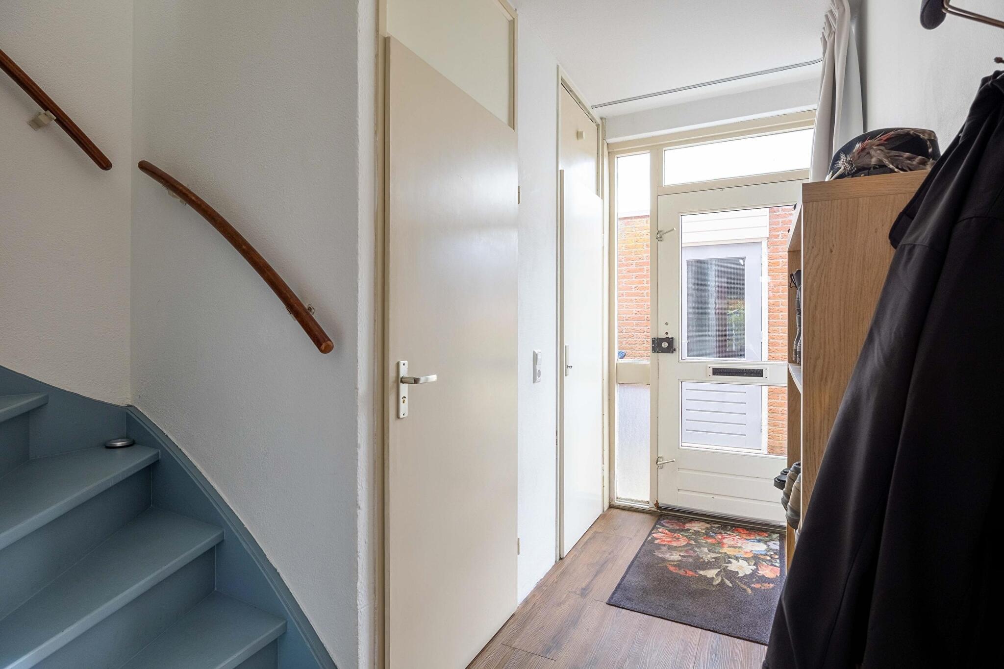 Bij het binnentreden van de woning kom je in de hal met ruimte voor het ophangen van je jassen en opbergen van je schoenen. Ook bevindt zich hier de meterkast (vernieuwd in 2021), het toilet met fontein en de trap naar boven.