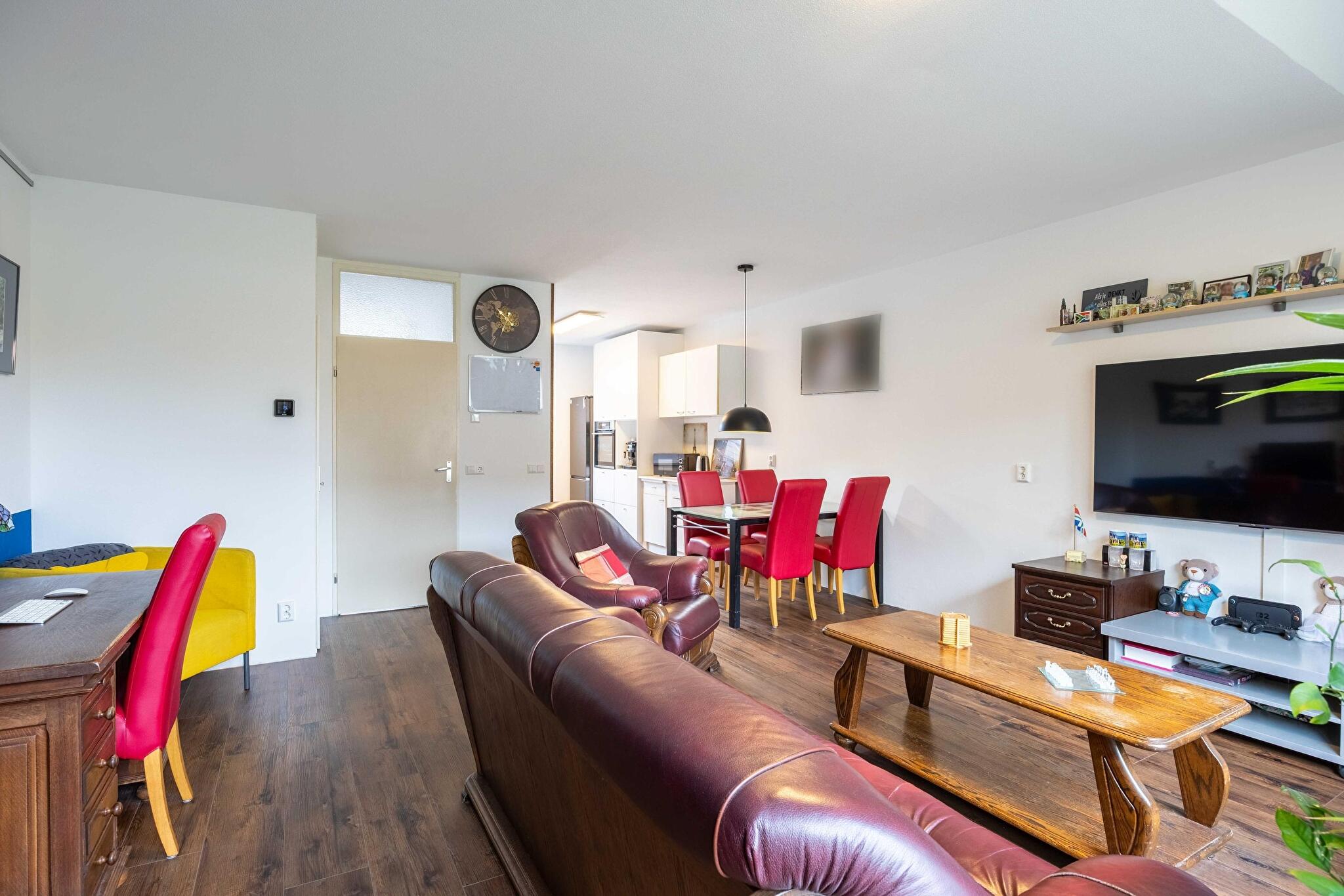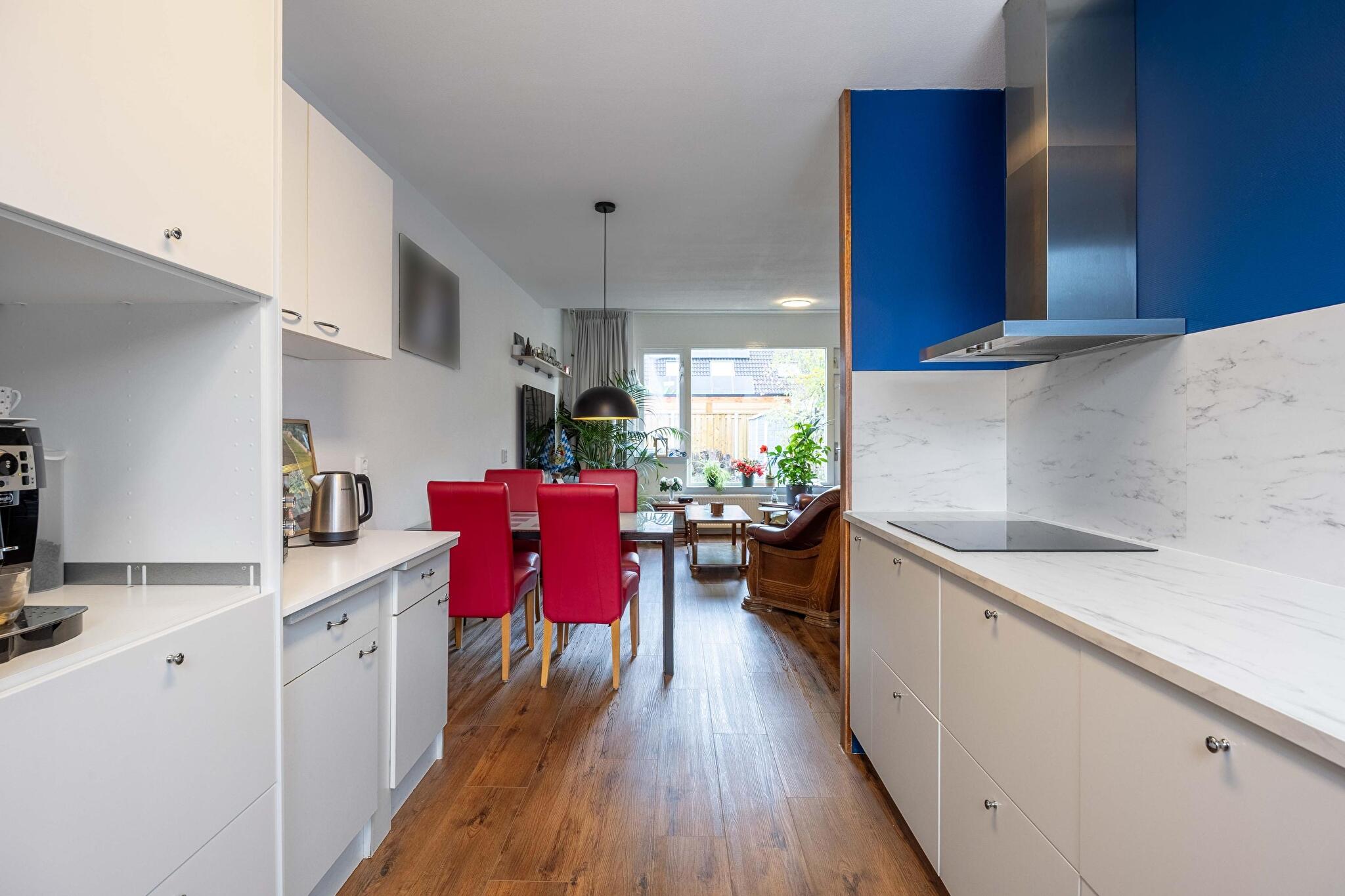 De woonkamer is licht en ruim, dankzij de grote raampartij en de tuindeur schijnt de zon 's morgens je woonkamer naar binnen. De woonkamer staat in verbinding met de keuken welke is uitgevoerd in parallelopstelling en voorzien van inbouwapparatuur.