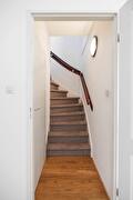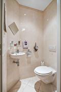 Vanuit de kamer toegang tot het trapportaal met toilet; toilet is voorzien van een wandcloset en een fonteintje.