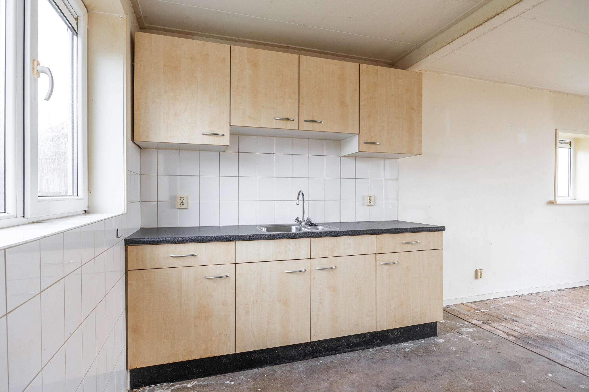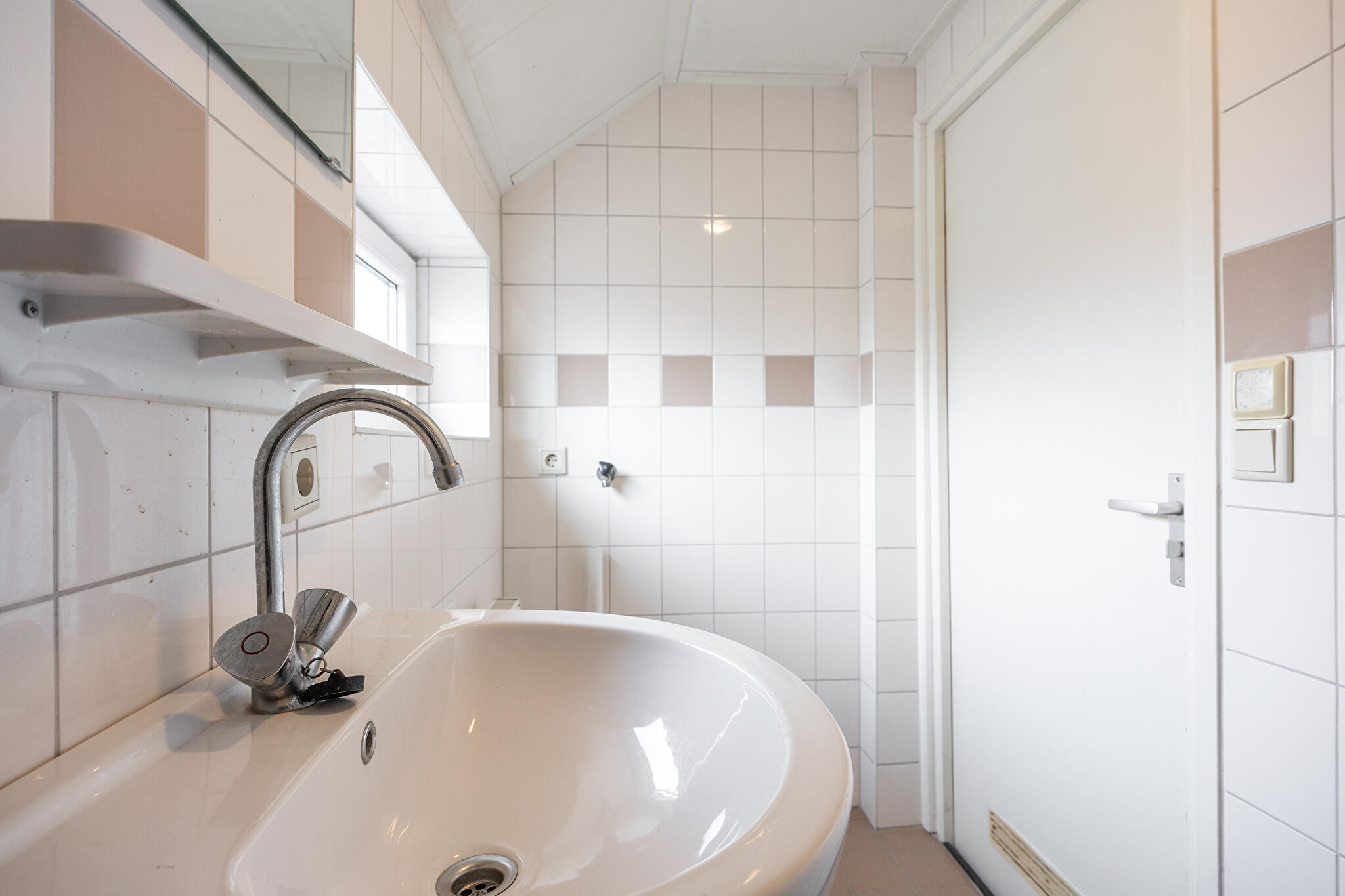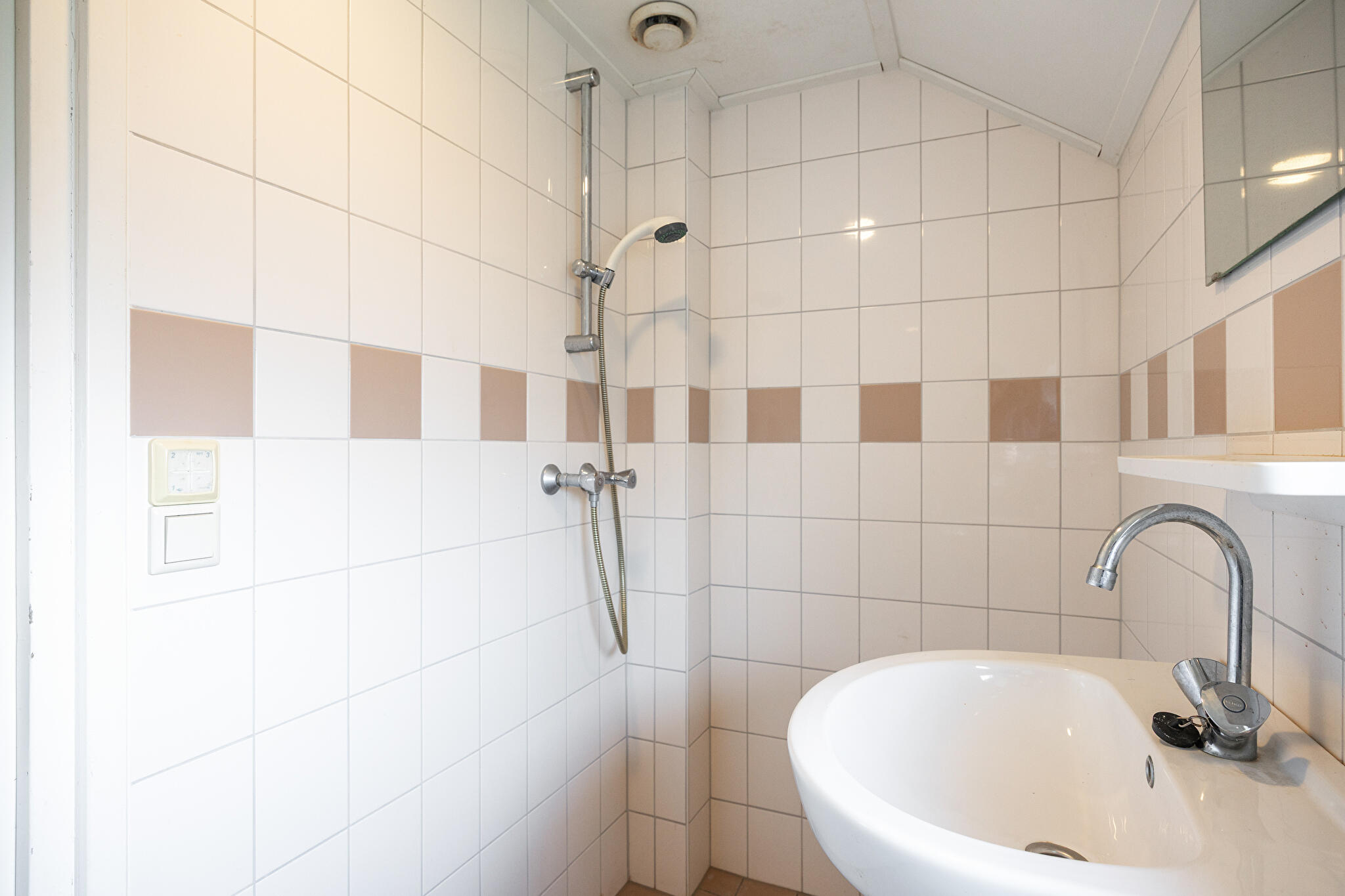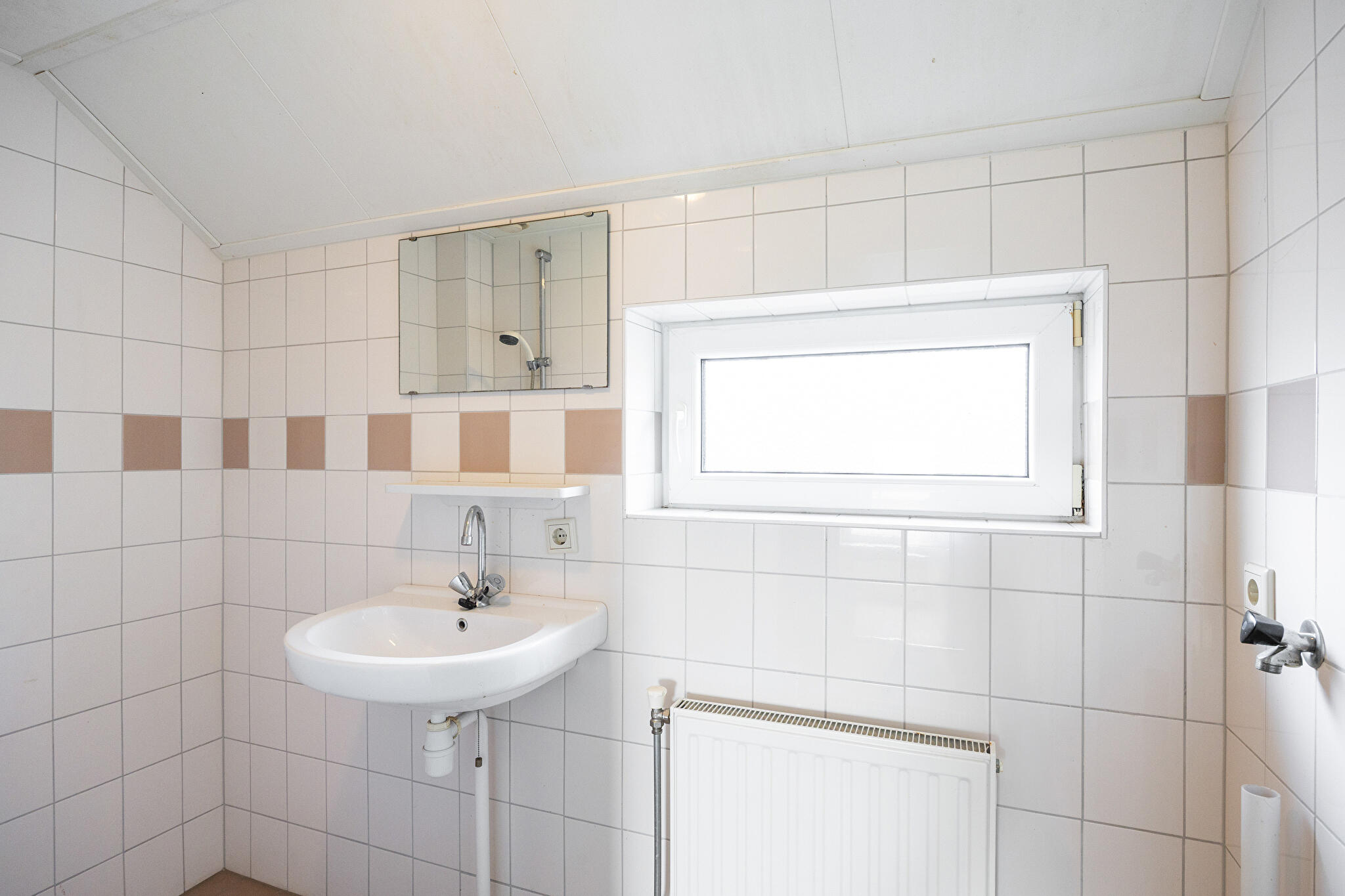 Badkamer – compact en functioneel! Op deze verdieping zit ook de badkamer. Hier heb je alles wat je nodig hebt: een wastafel, een douche, verwarming én aansluitingen voor witgoed. Alles direct bij de hand, zodat je ‘s ochtends snel en efficiënt aan je dag kunt beginnen. Uiteraard is deze ruimte eveneens een blank canvas voor wie dromen heeft over een mooie regendouche of extra luxe.
