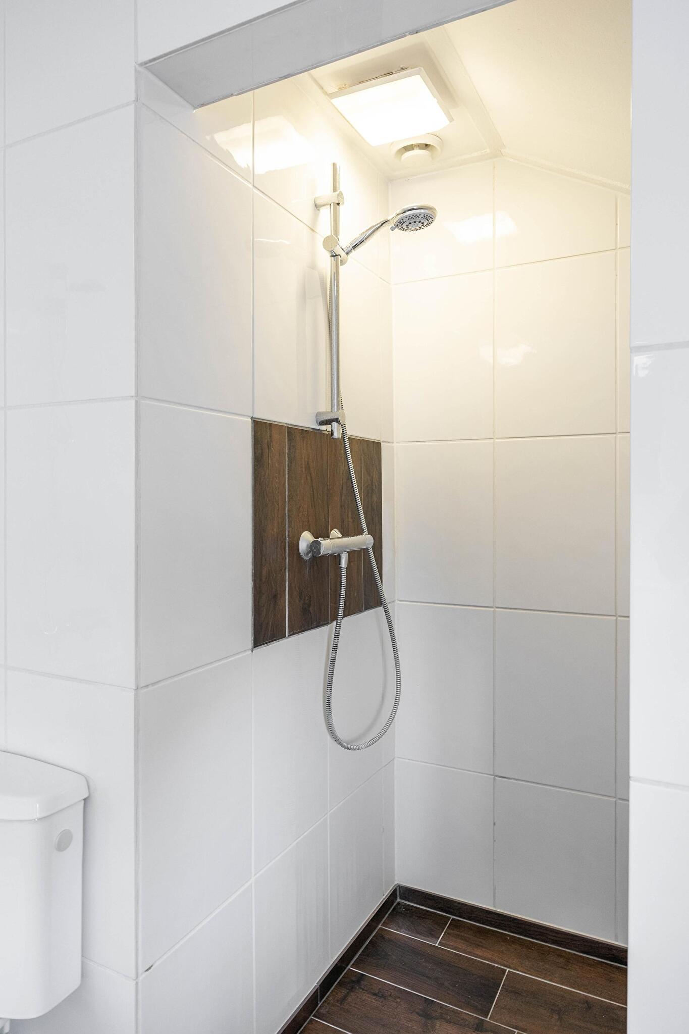 De woning telt twee slaapkamers. Daarvan ligt er eentje (met de badkamer er pal naast!) op de begane grond. Superhandig als je ’s ochtends nog half slaapwandelend onder de douche wilt stappen. Of als je gewoon geen zin hebt in traplopen: alles wat je nodig hebt bij de hand!