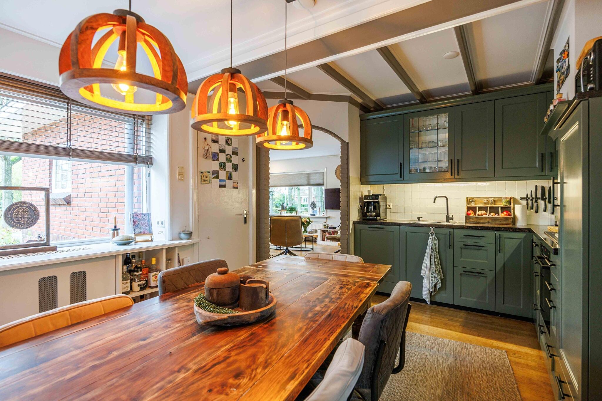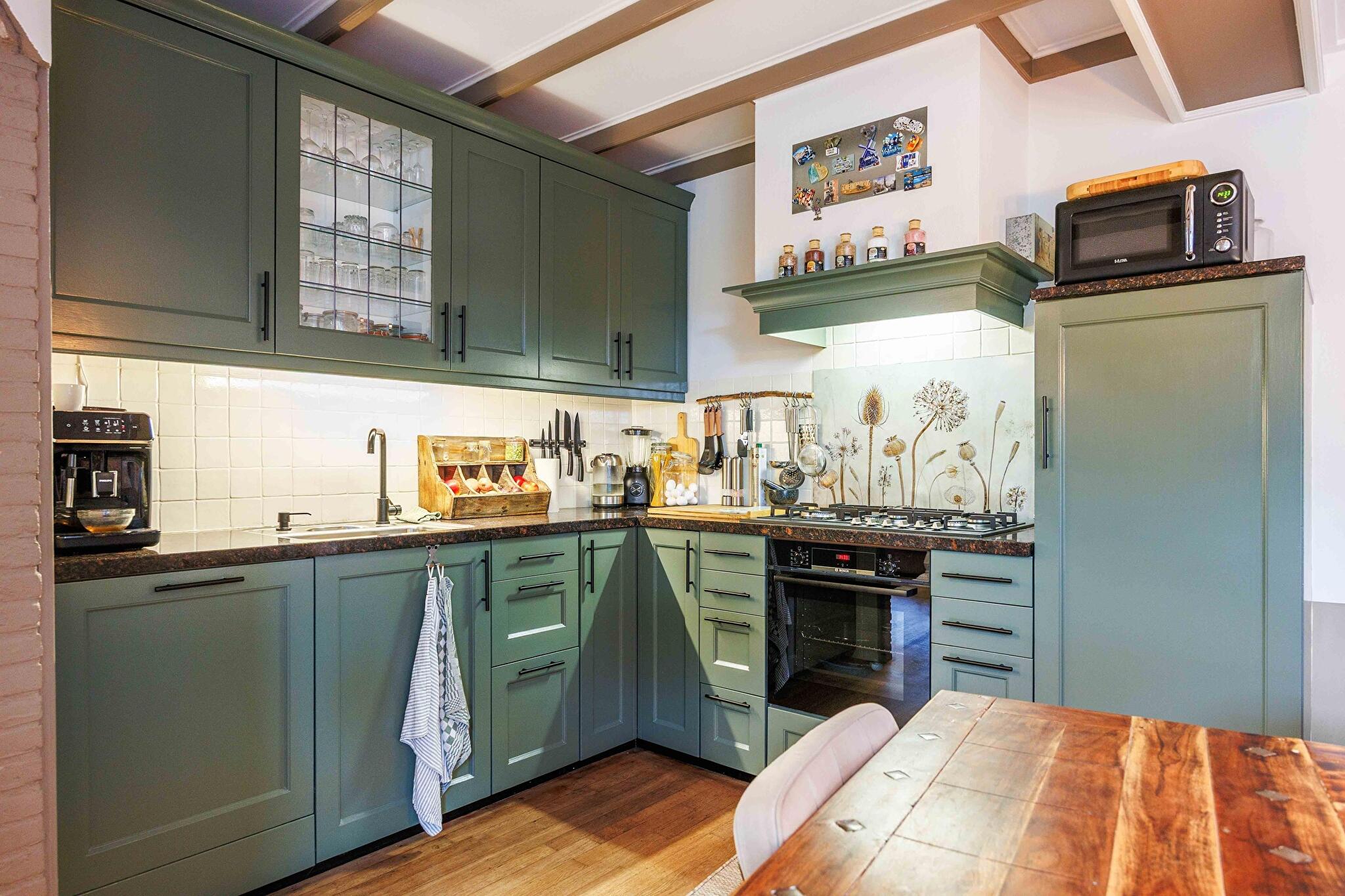 Aan de woonkamer grenst ook nog eens een fijne, halfopen woonkeuken. De hoekopstelling is uitgerust met alles wat je nodig hebt, denk aan een koeler, een vaatwasser, oven, vijfpits gasfornuis, afzuigkap én een keukenboiler. Handig: vanuit de keuken heb je nog toegang tot een kelder, ideaal voor je voorraad en ook nog een berging/bijkeuken met achterentree. Deze ruimte is ideaal als extra opslag. Nooit meer jassen rondslingeren of schoenen kwijt!