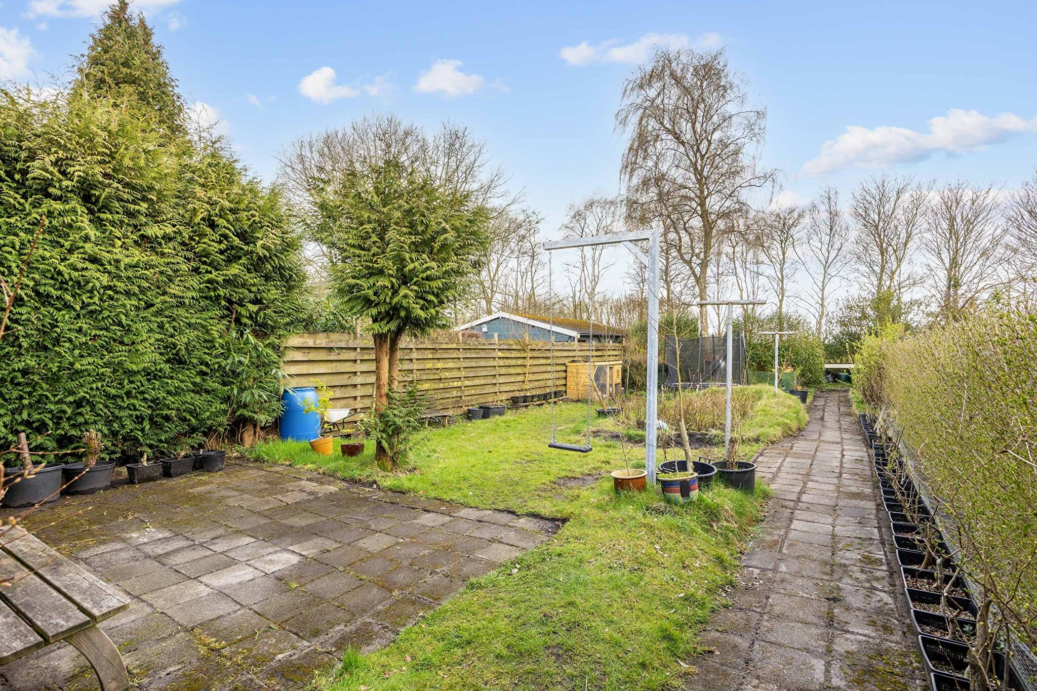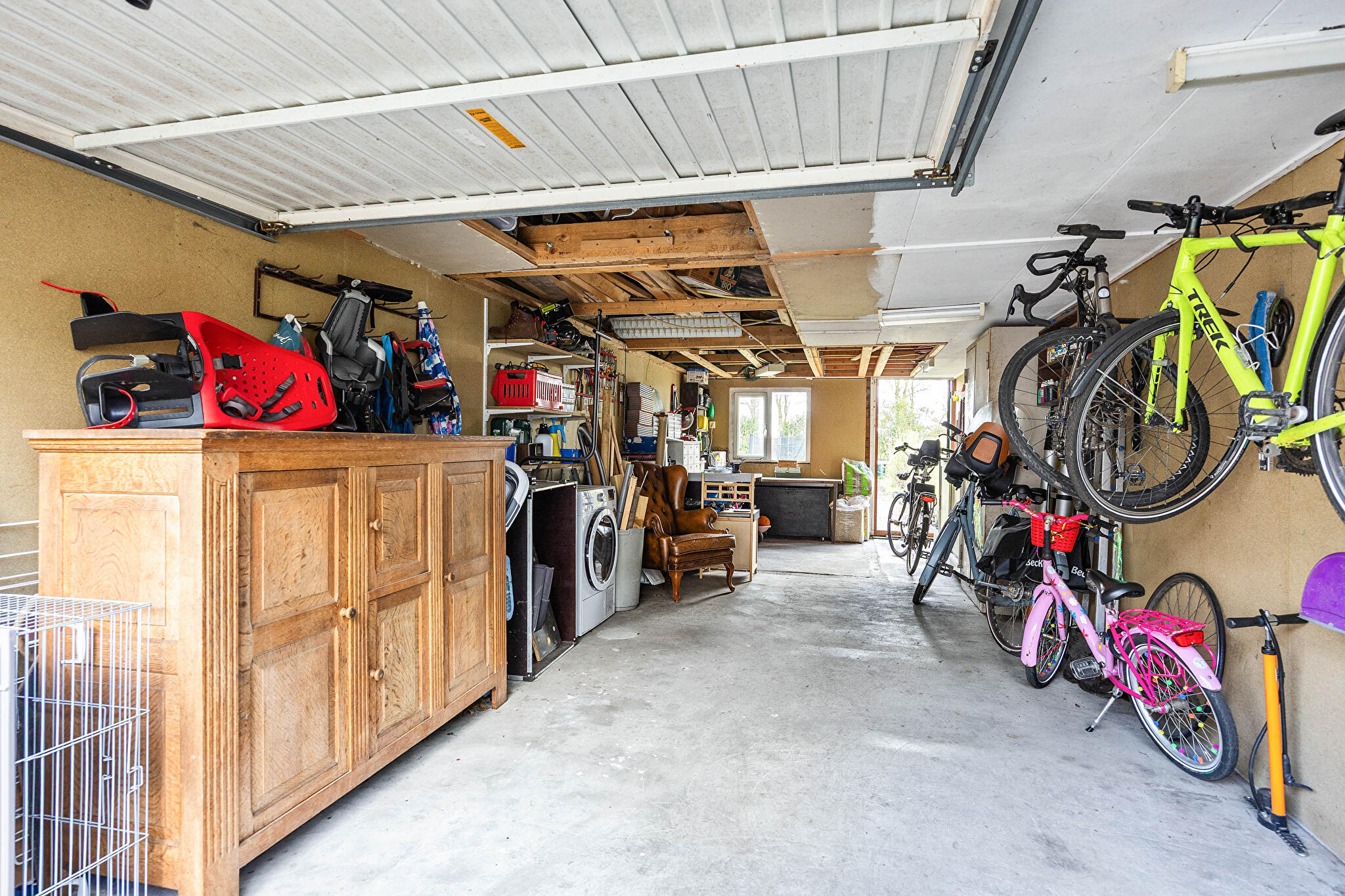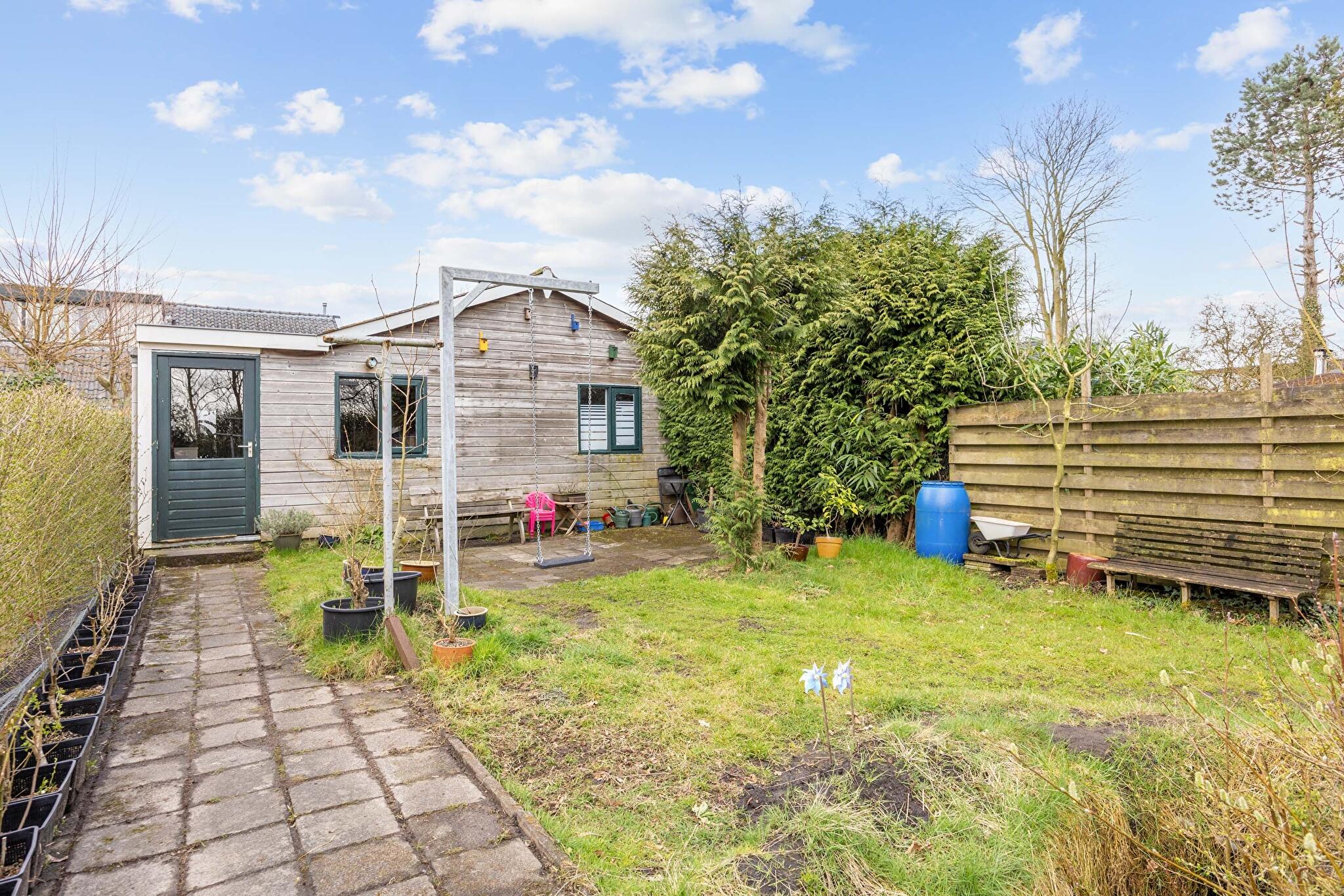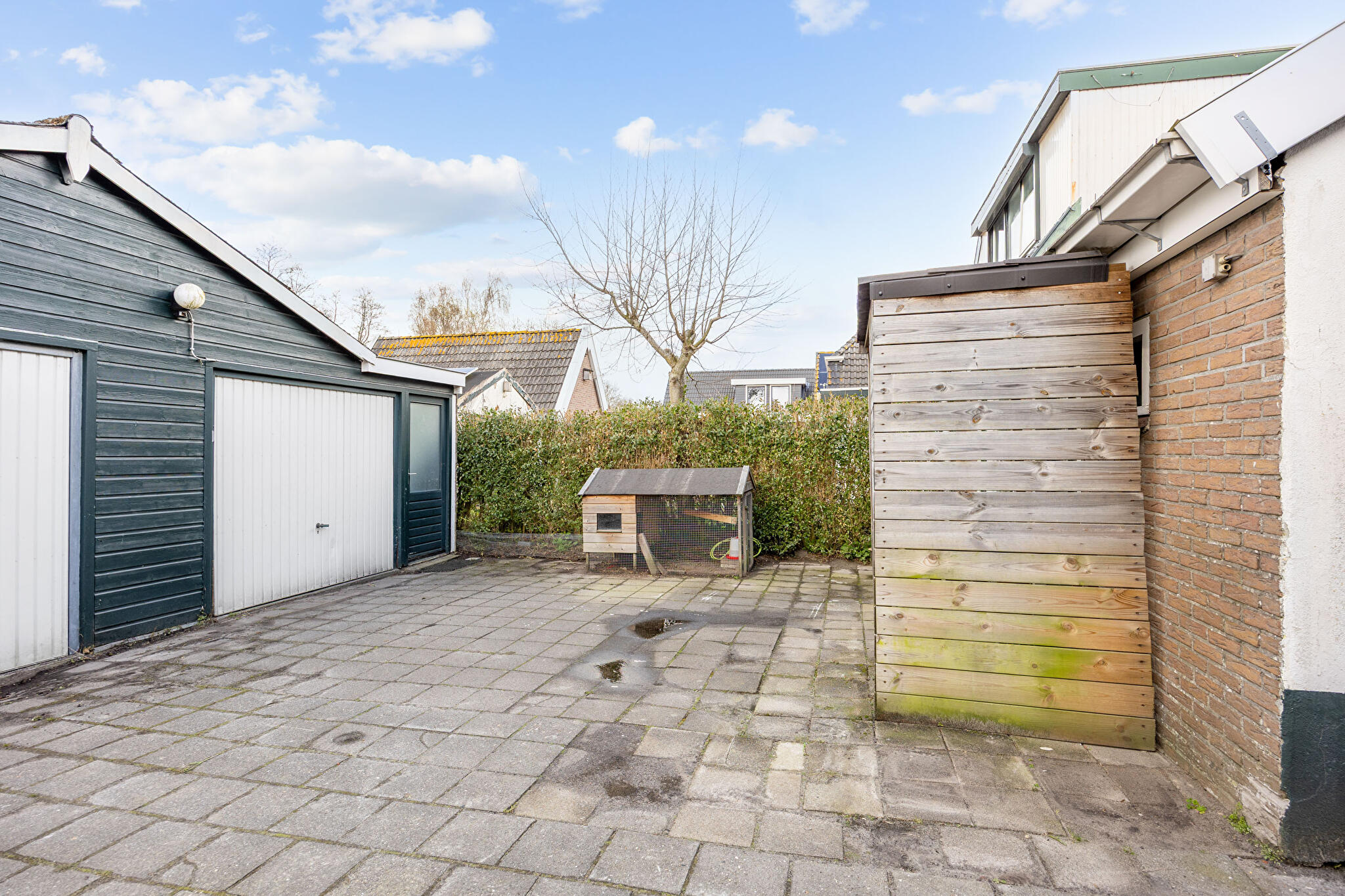 De zonnige achtertuin is gelegen op het westen, ideaal voor liefhebbers van middag- en avondzon. De aanwezige garage zorgt niet alleen voor praktische bergruimte, maar creëert ook een speelse scheiding tussen het terras en het achtergelegen grasveld.