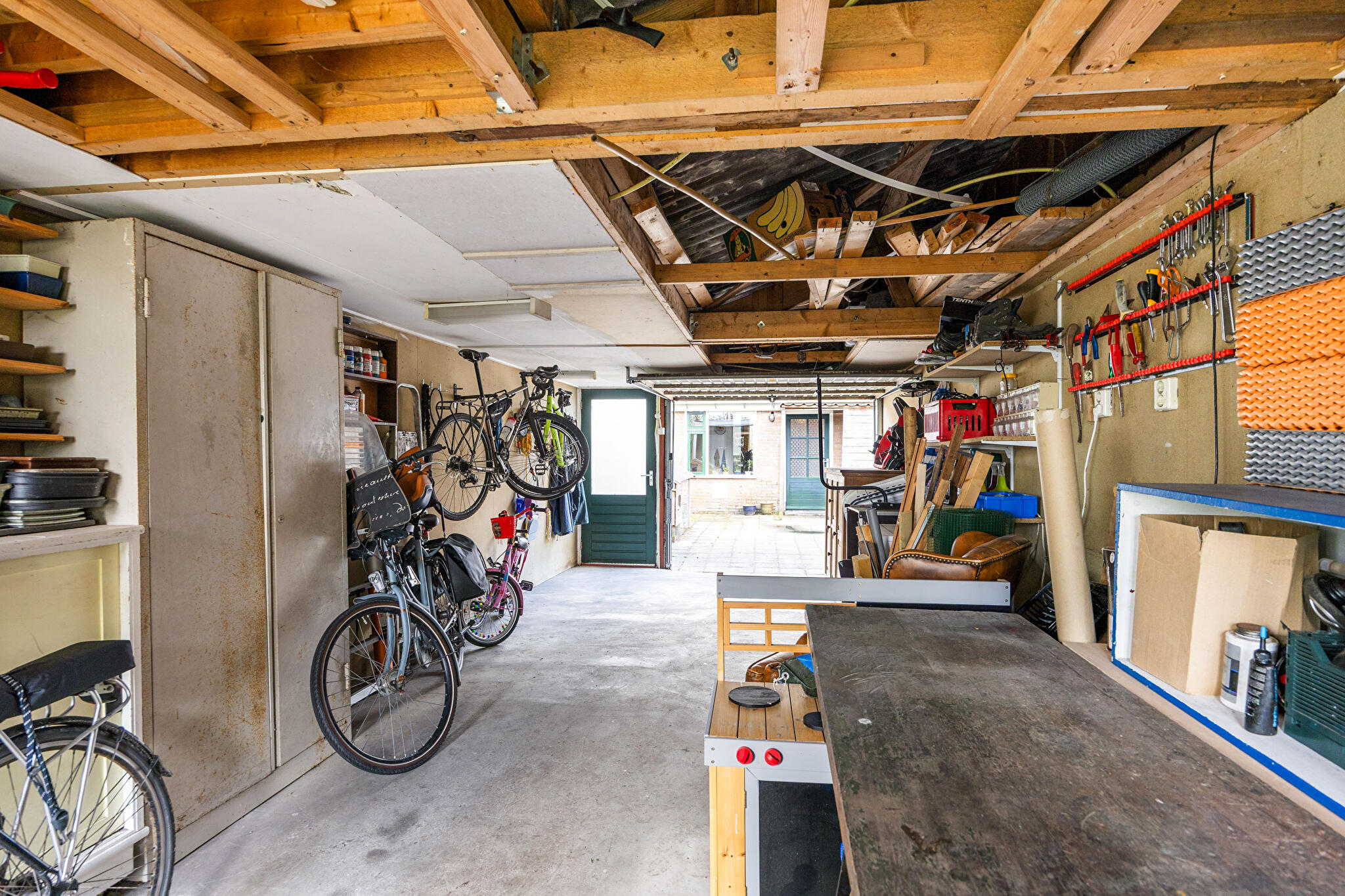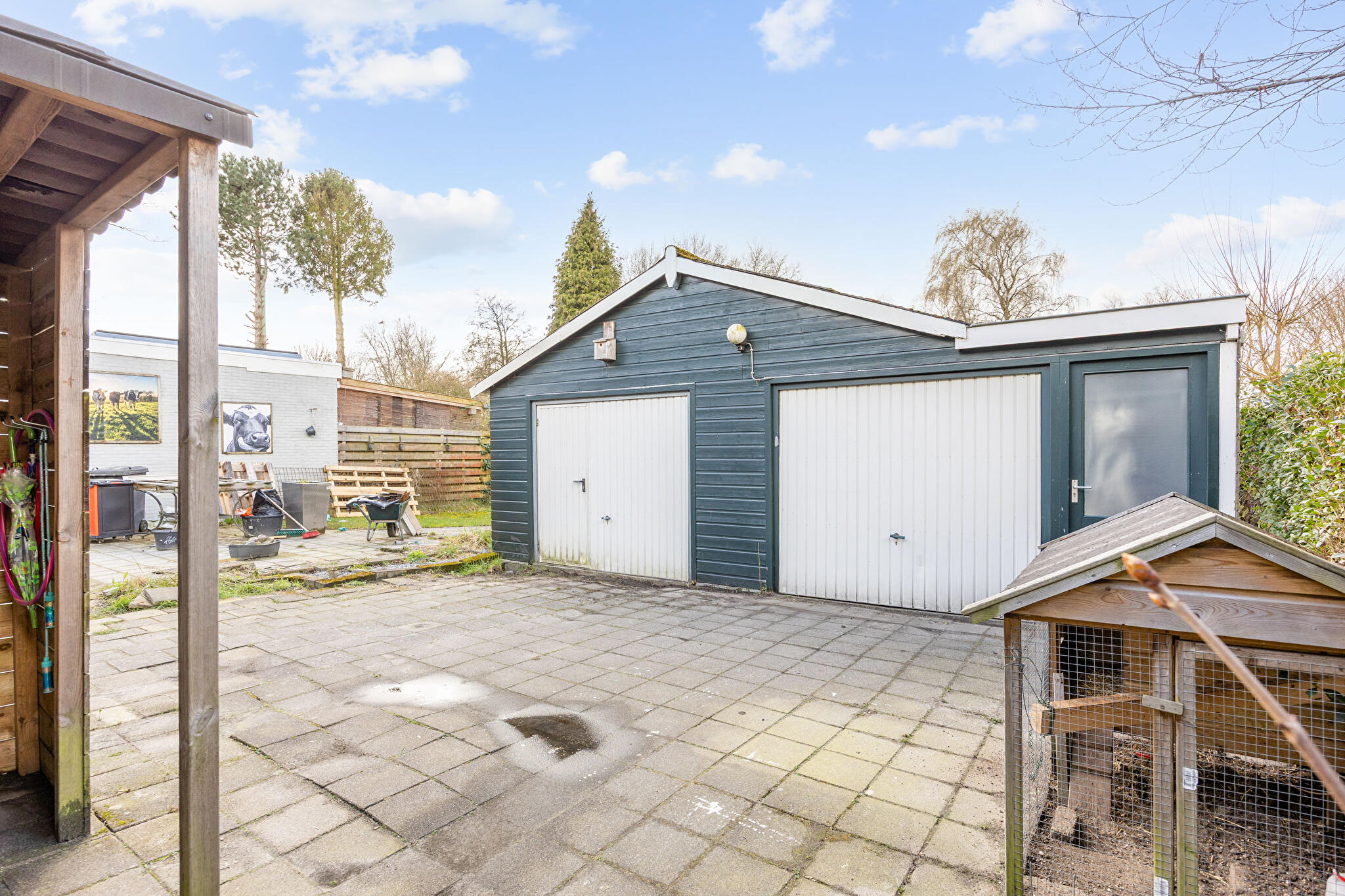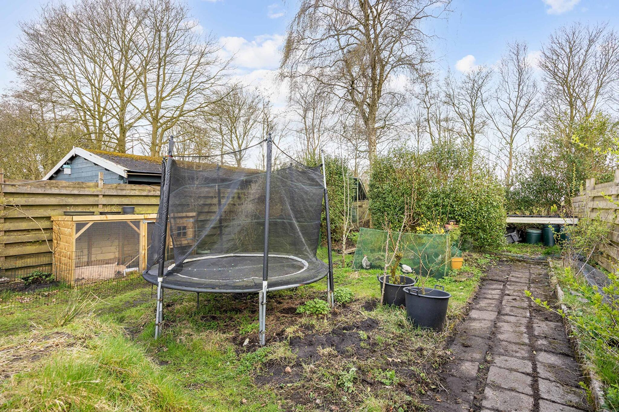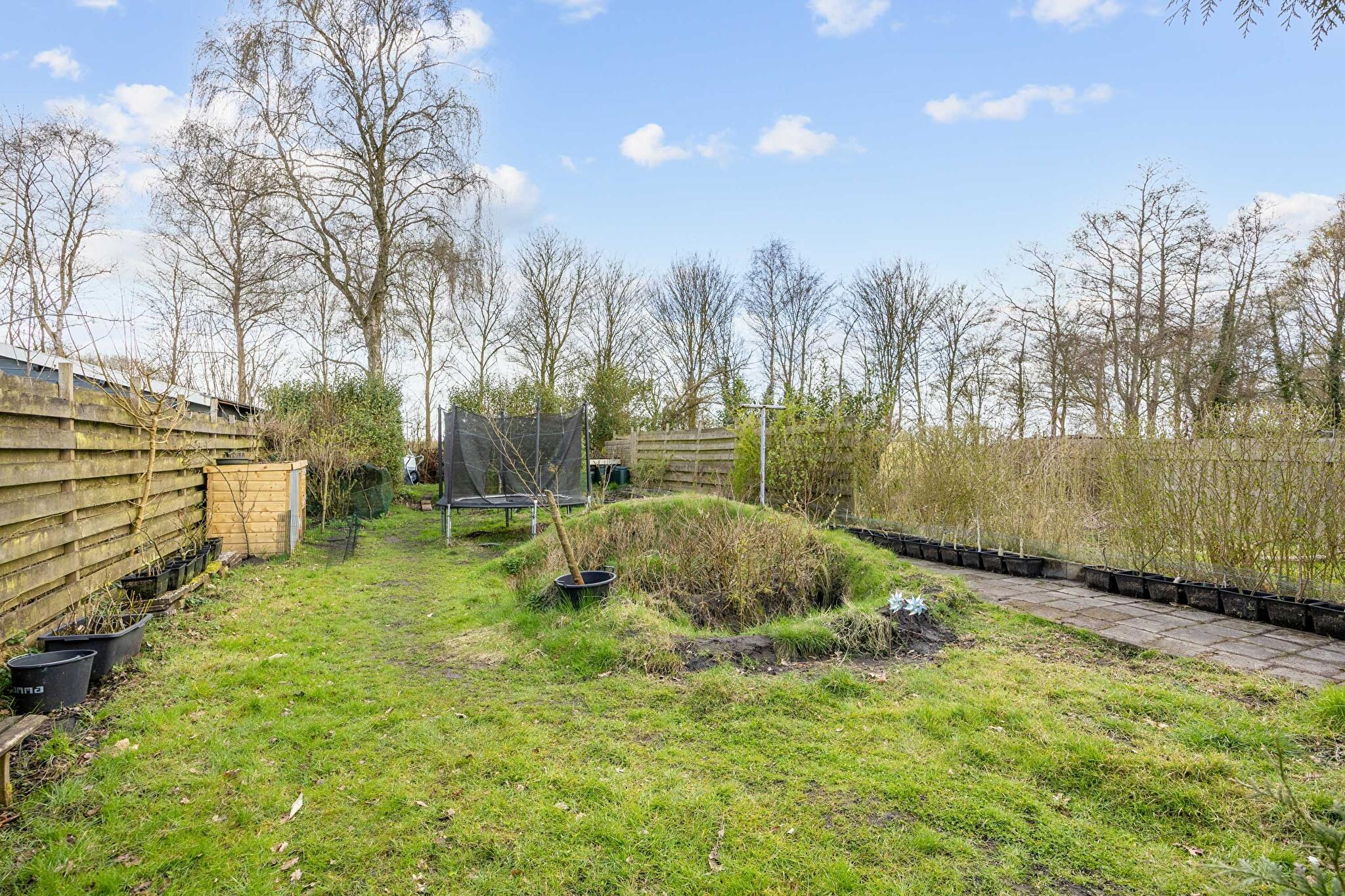 De zonnige achtertuin is gelegen op het westen, ideaal voor liefhebbers van middag- en avondzon. De aanwezige garage zorgt niet alleen voor praktische bergruimte, maar creëert ook een speelse scheiding tussen het terras en het achtergelegen grasveld.