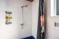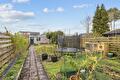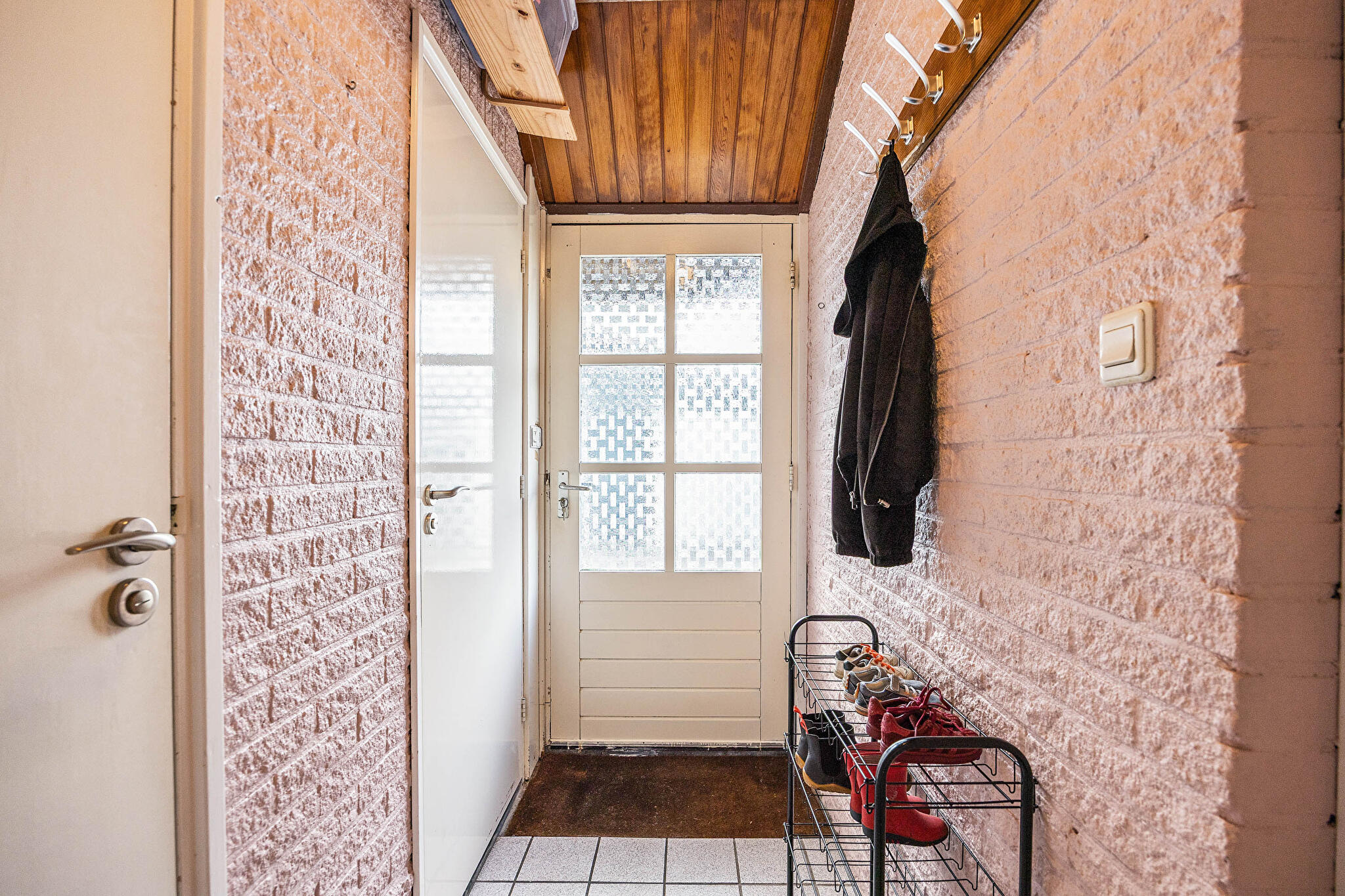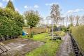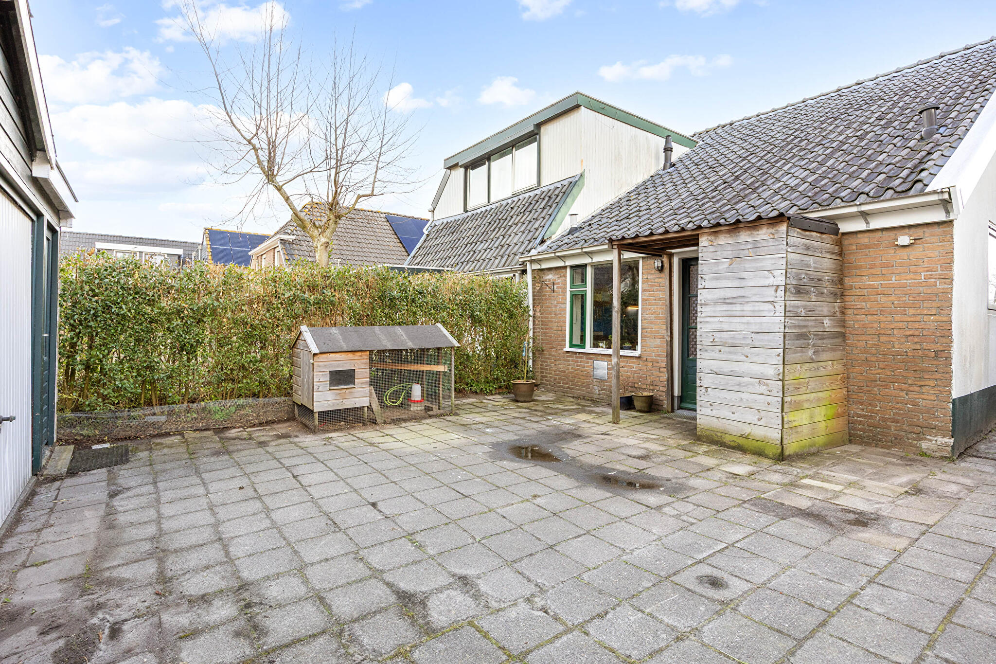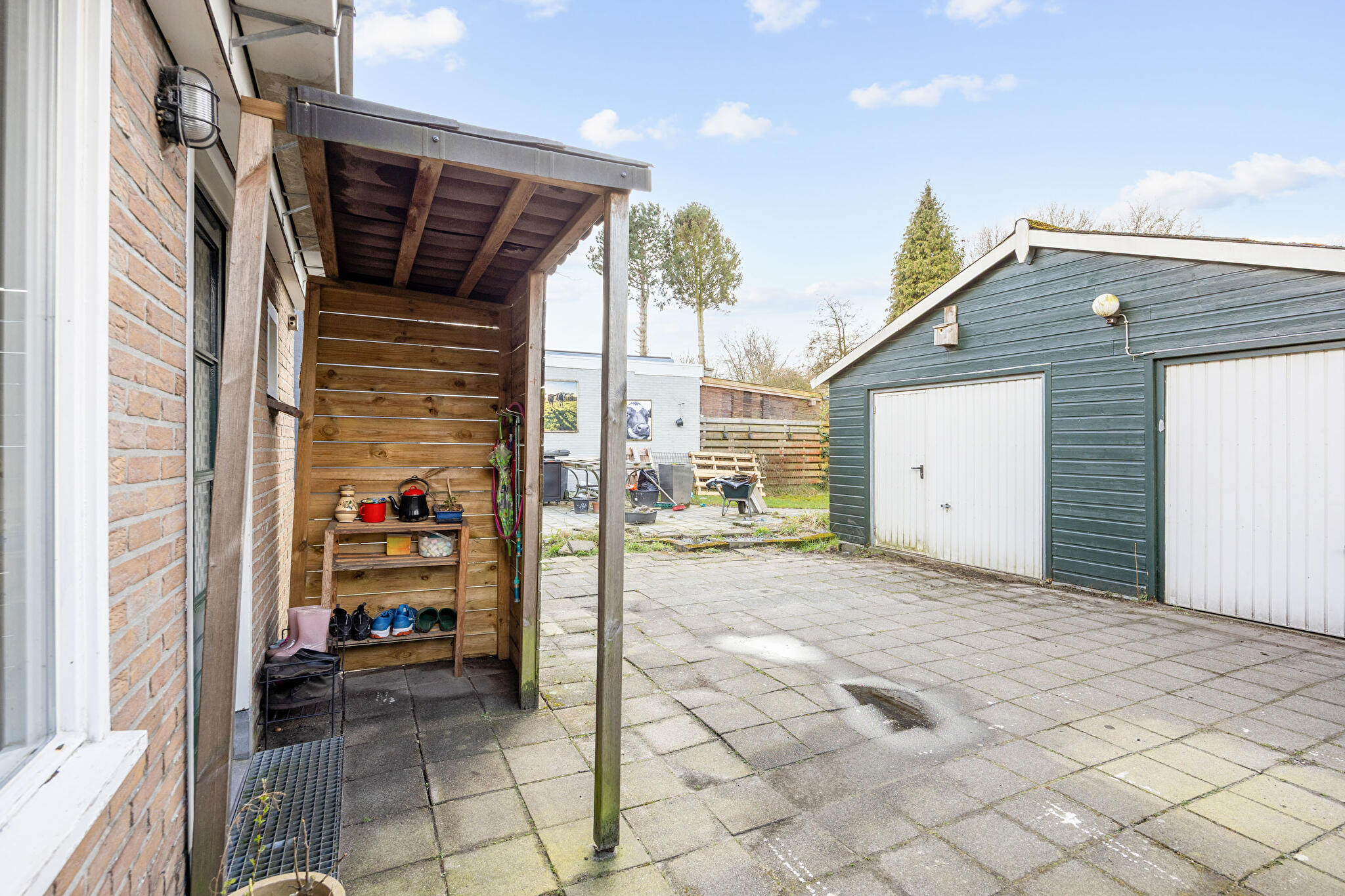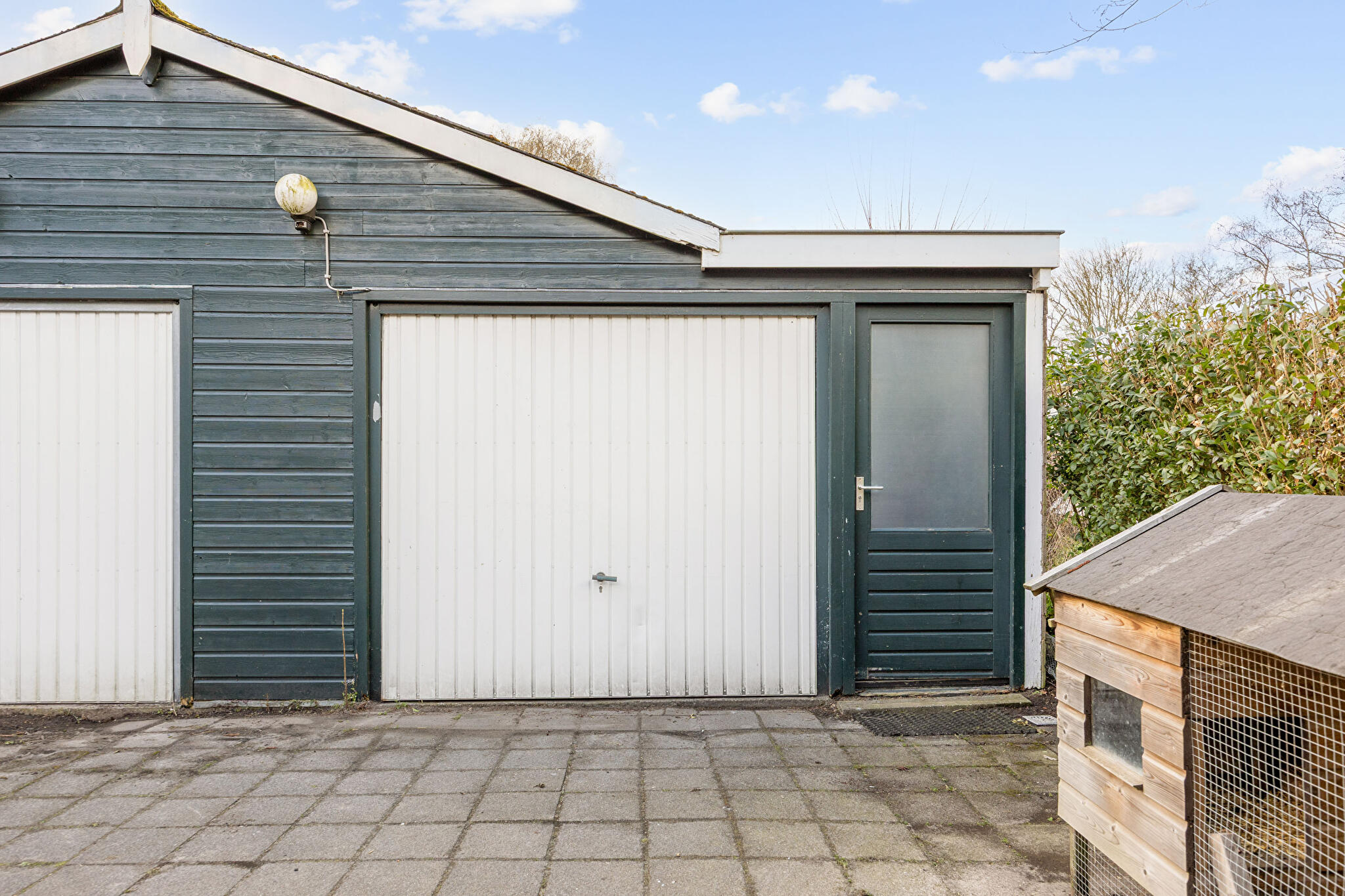 De zonnige achtertuin is gelegen op het westen, ideaal voor liefhebbers van middag- en avondzon. De aanwezige garage zorgt niet alleen voor praktische bergruimte, maar creëert ook een speelse scheiding tussen het terras en het achtergelegen grasveld.