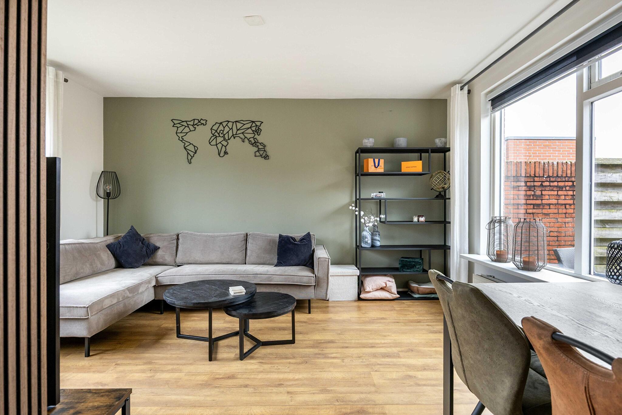 Loop verder naar de L-vormige woonkamer en voel hoe de ruimte zich als vanzelf om je heen vouwt. Hier kun je alle kanten op: een gezellige zithoek, eetkamer om lekker te eten met vrienden of familie. Het grote raam zorgt voor een fijne lichtinval, waardoor het altijd goed toeven is, zelfs op minder zonnige dagen.