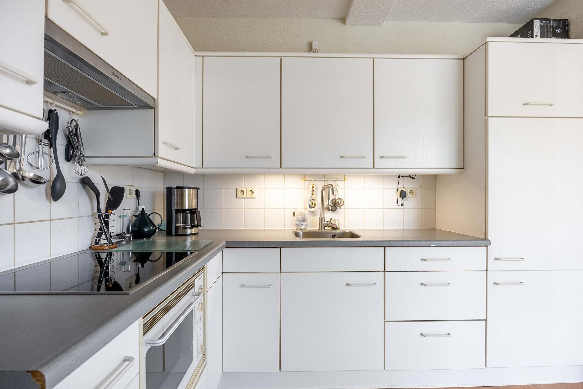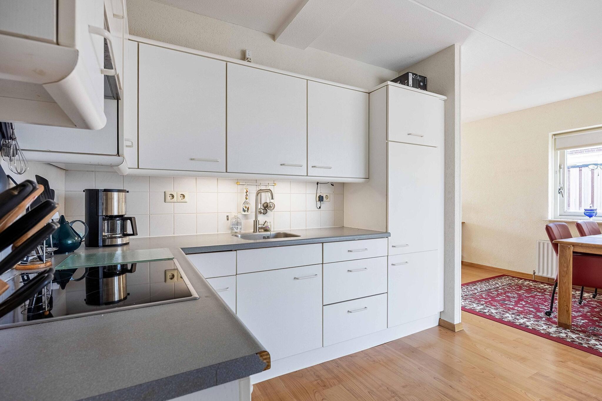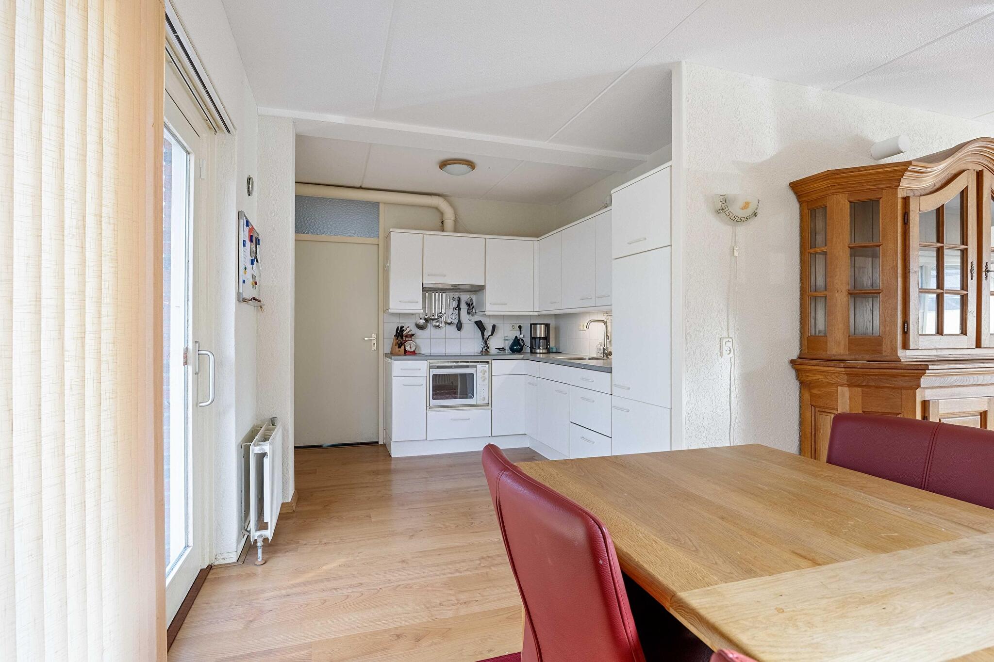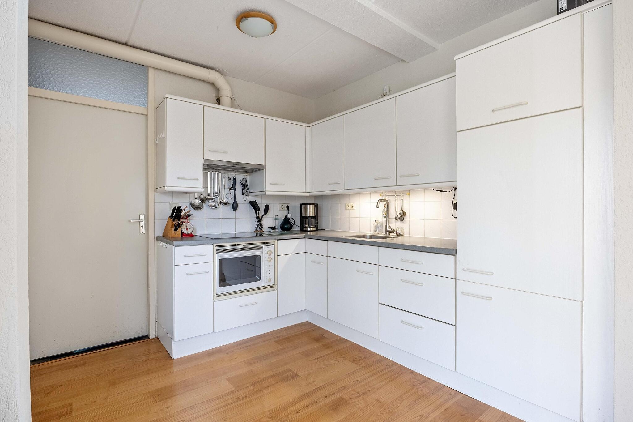 De halfopen keuken is eenvoudig maar netjes te noemen: koken wordt een feestje dankzij de aanwezige oven, afzuigkap en keramische kookplaat. In de naastgelegen bijkeuken kun je eenvoudig al het wasgoed kwijt, staat de cv-ketel netjes uit het zicht, en heb je directe toegang tot de tuin via de achterdeur. Wat een luxe!