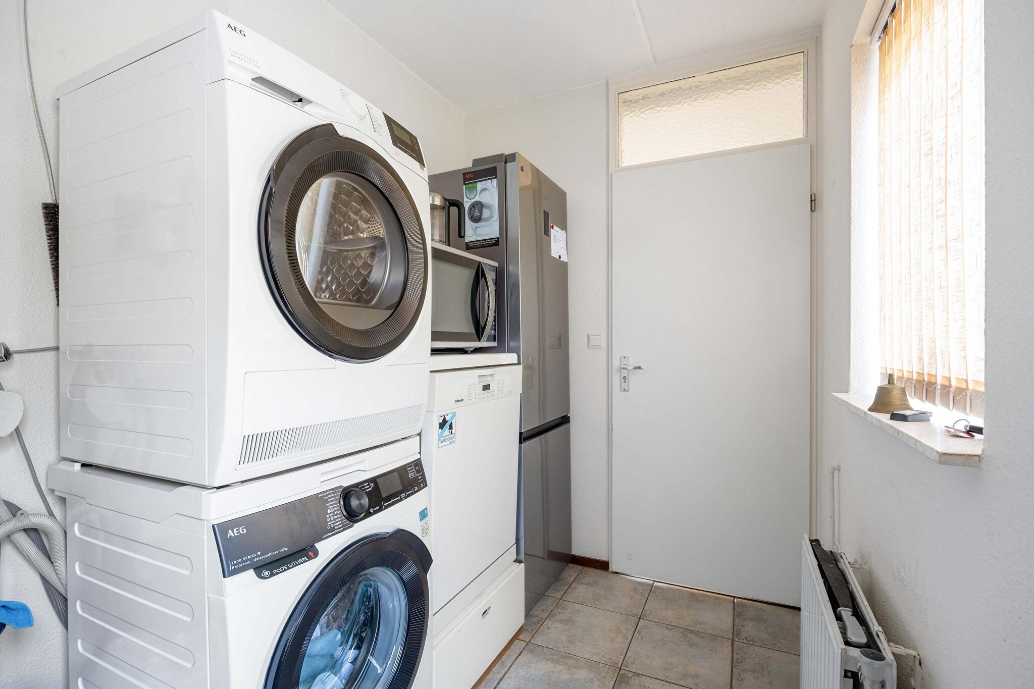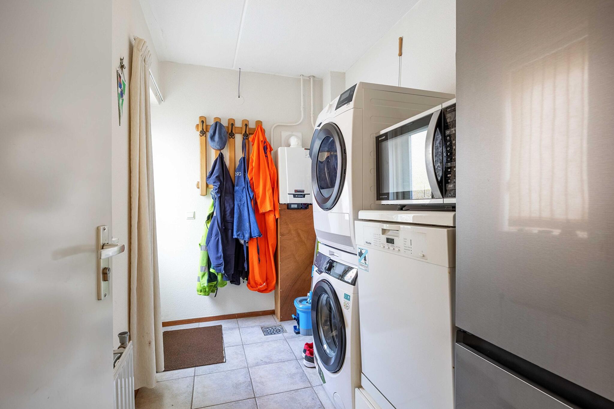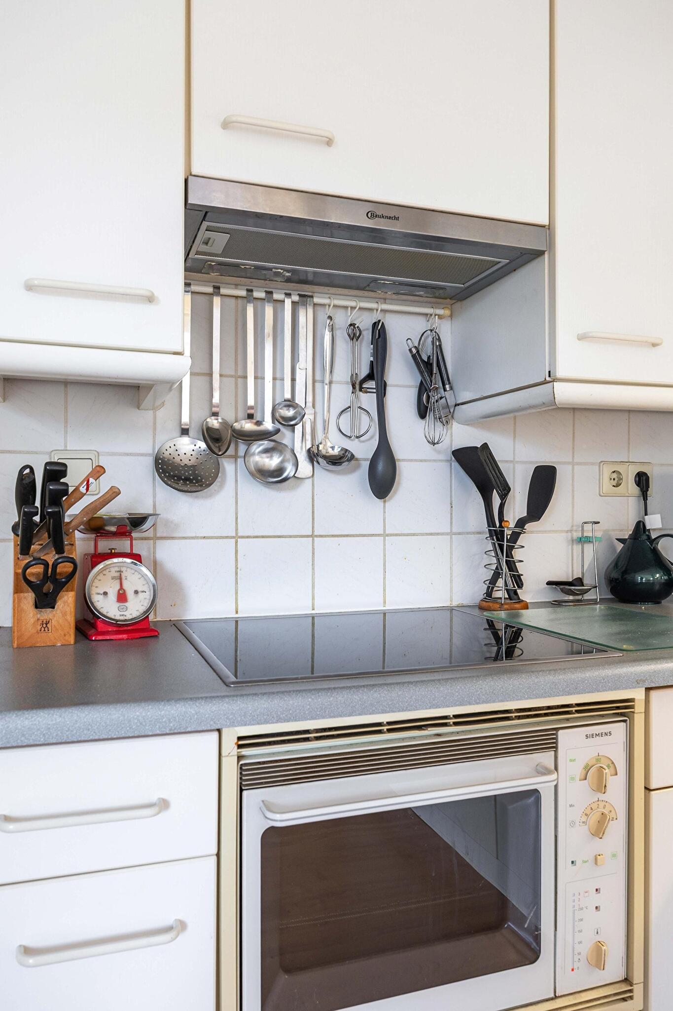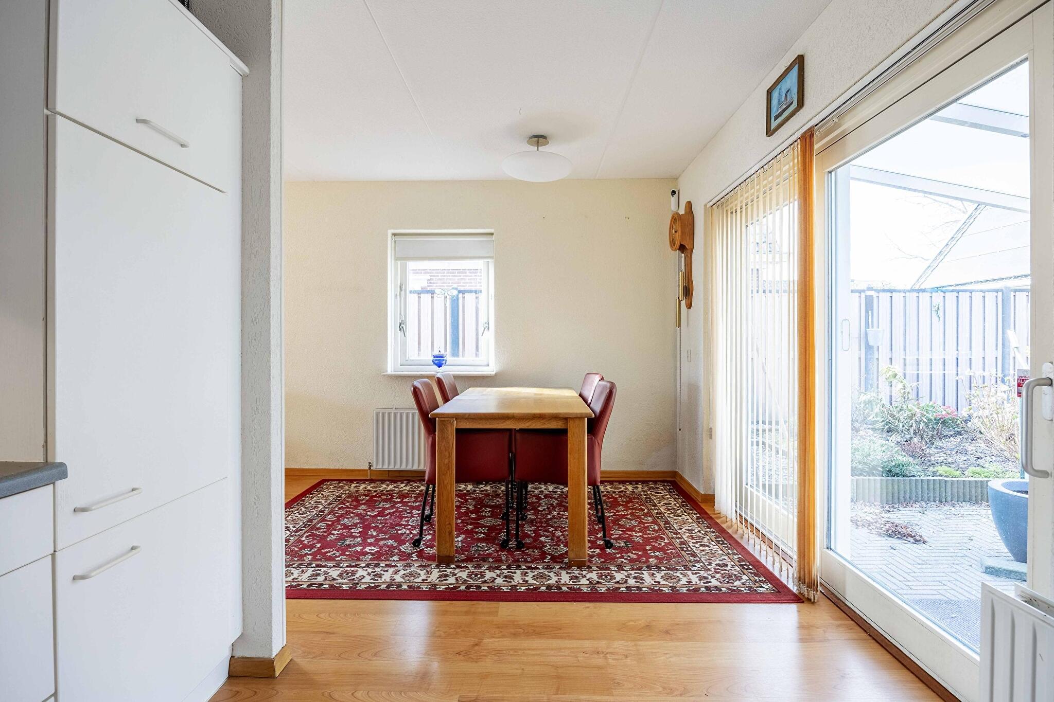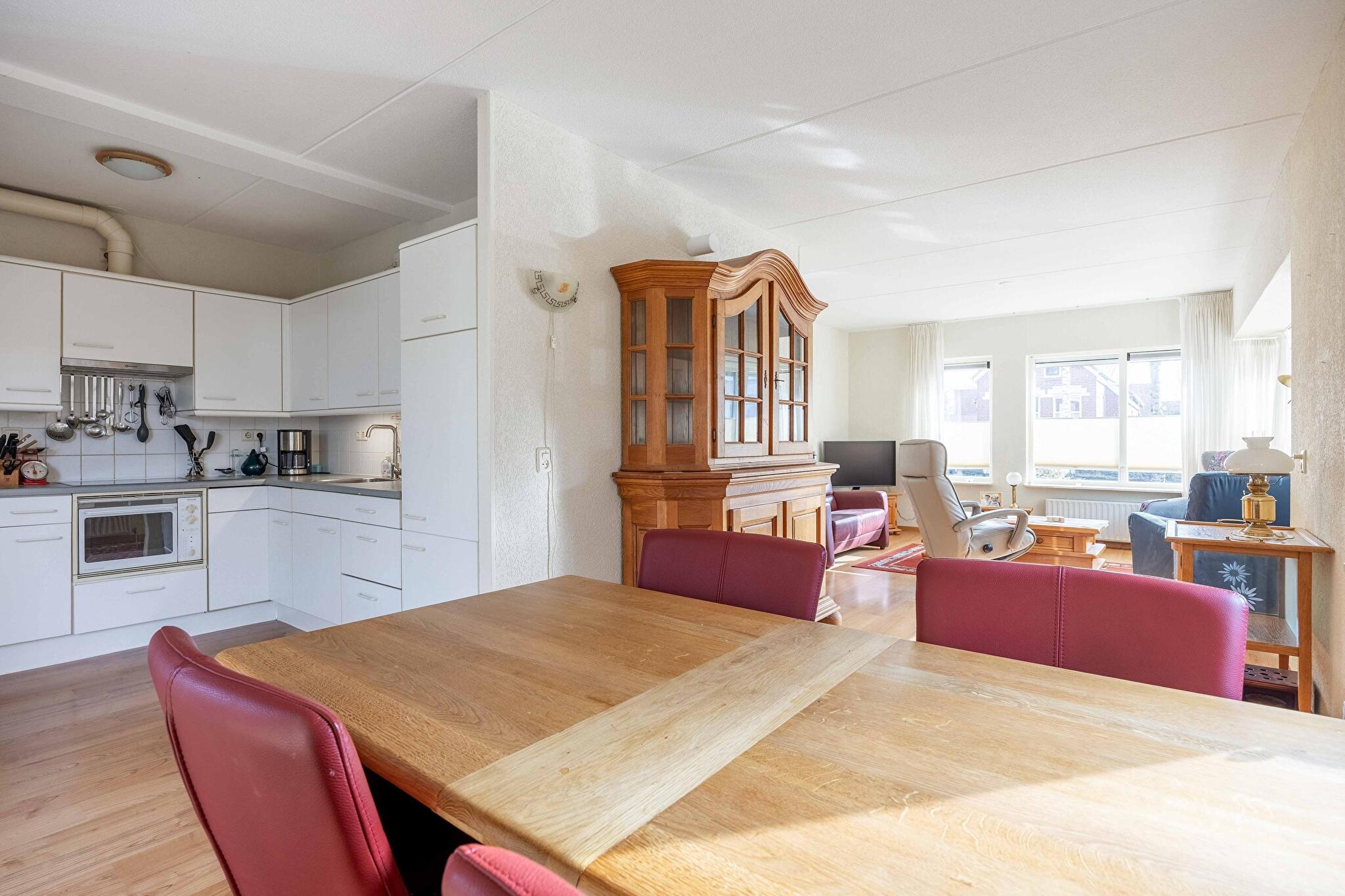 De halfopen keuken is eenvoudig maar netjes te noemen: koken wordt een feestje dankzij de aanwezige oven, afzuigkap en keramische kookplaat. In de naastgelegen bijkeuken kun je eenvoudig al het wasgoed kwijt, staat de cv-ketel netjes uit het zicht, en heb je directe toegang tot de tuin via de achterdeur. Wat een luxe!