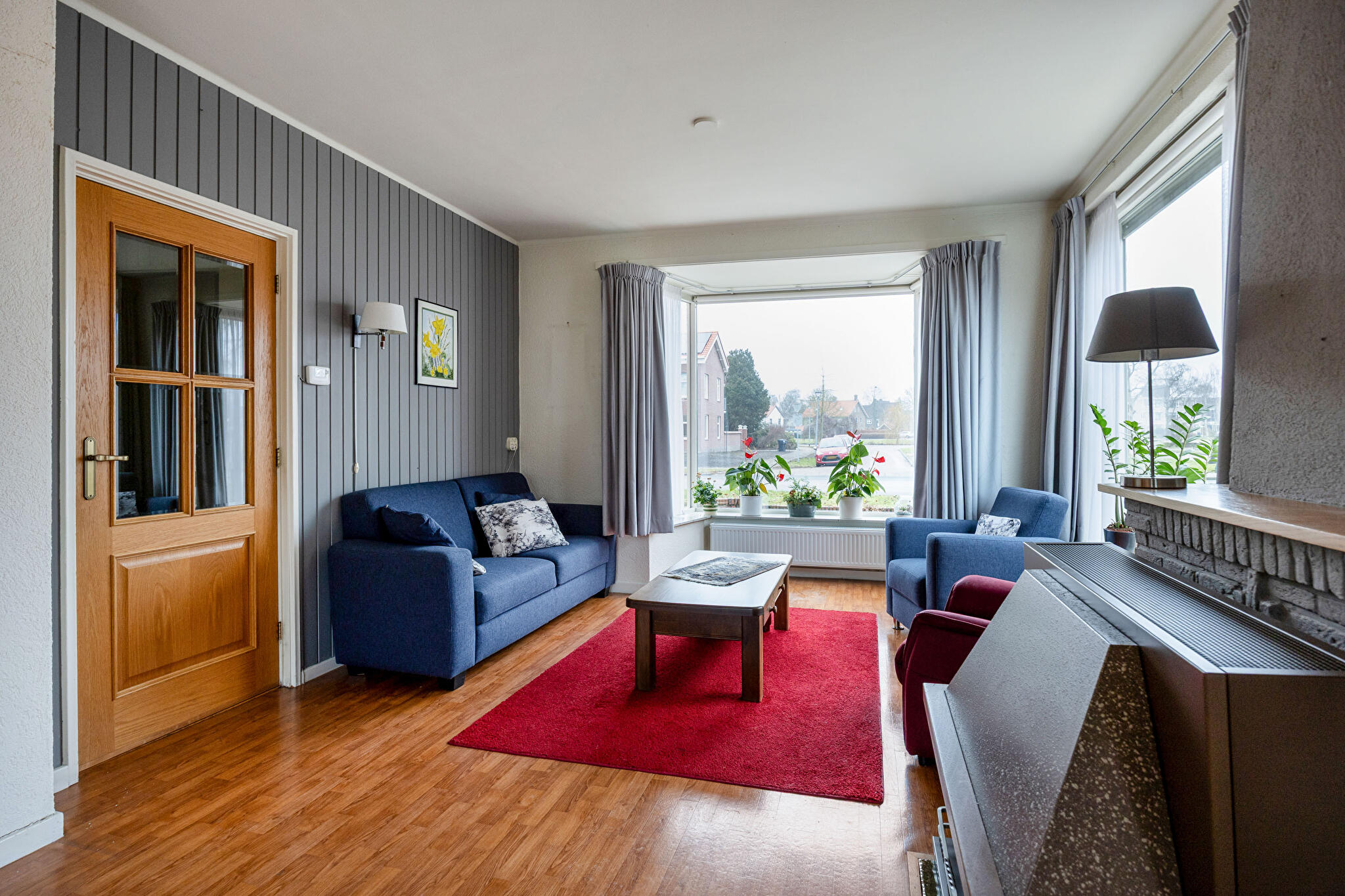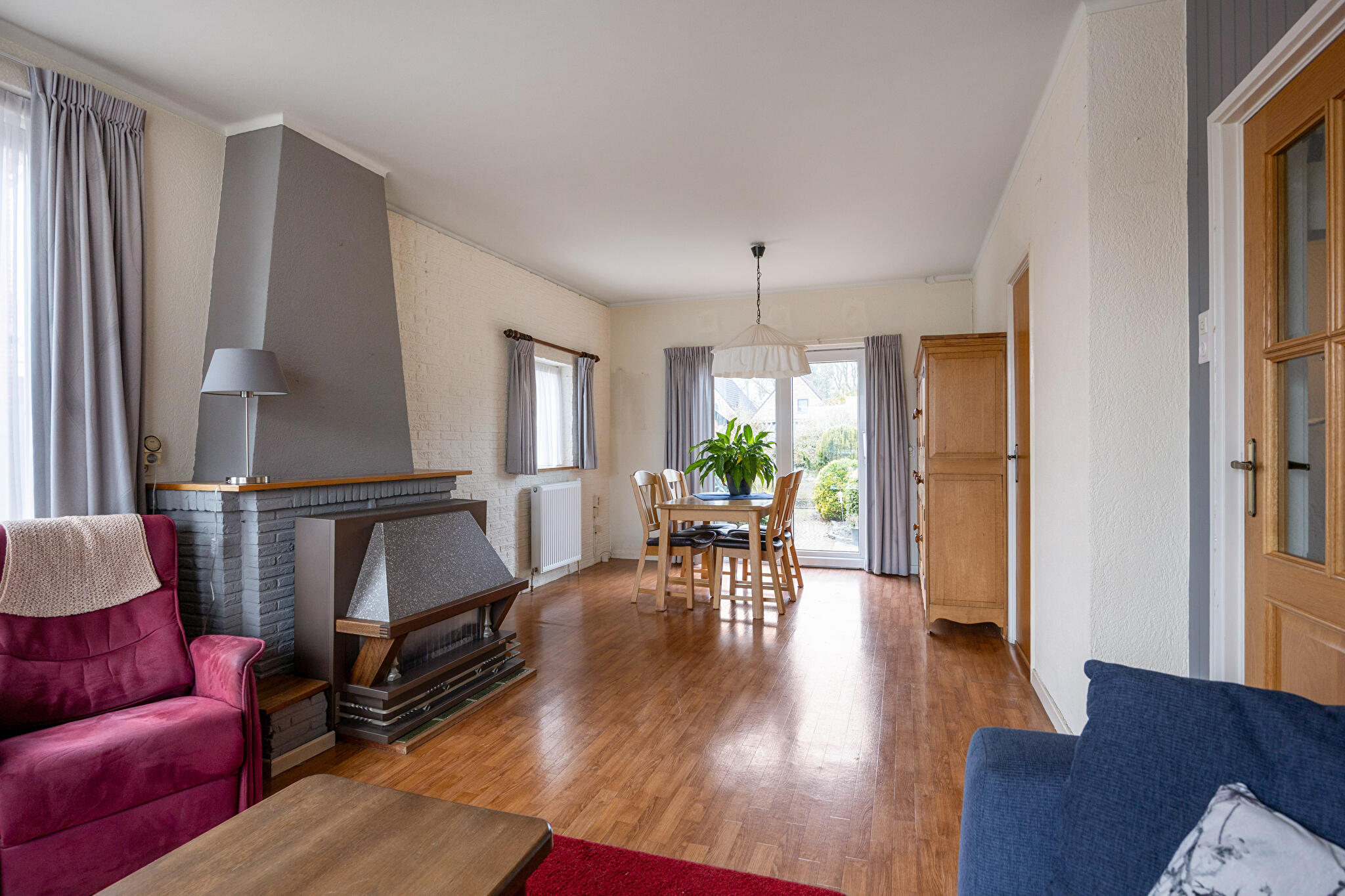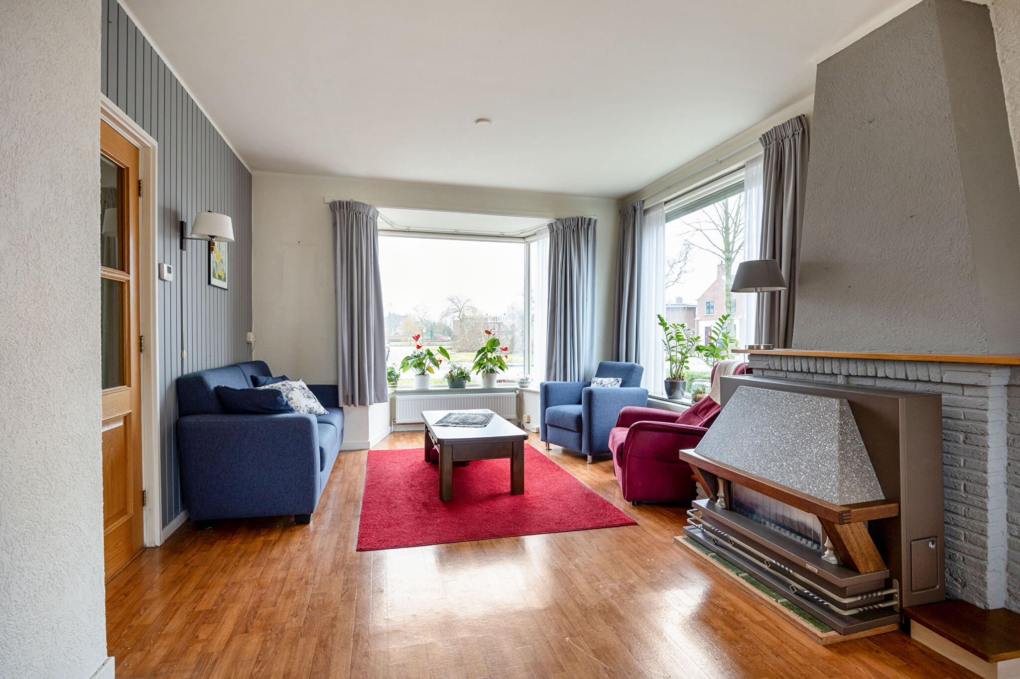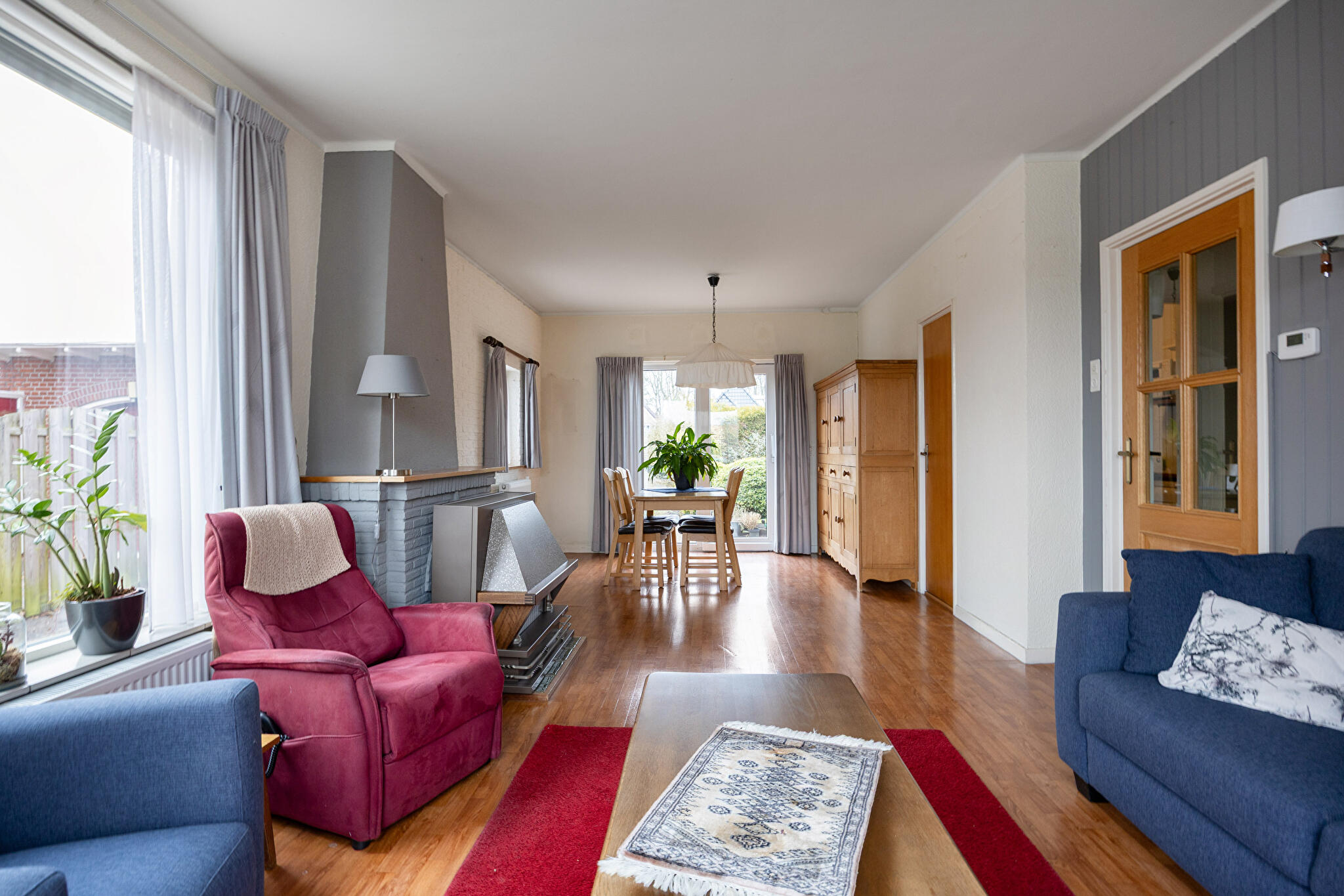 Stap binnen in de ruime hal, waar het direct duidelijk wordt dat dit huis met zorg is bewoond. De hal biedt naast de meterkast ook handige bergruimte in de kelder/trapkast – ideaal voor je voorraad. De toiletruimte biedt een toilet en een fonteintje. Vervolgens kom je in de lichte woonkamer, waar de gezellige gashaard direct voor sfeer zorgt tijdens onweersbuitjes of koude winteravonden. Dankzij de erker geniet je niet alleen van veel daglicht, maar ook van een heerlijk vrij uitzicht op het groen en in de verte een fraaie vijver: een panorama waar je elke ochtend even bij weg kunt dromen.