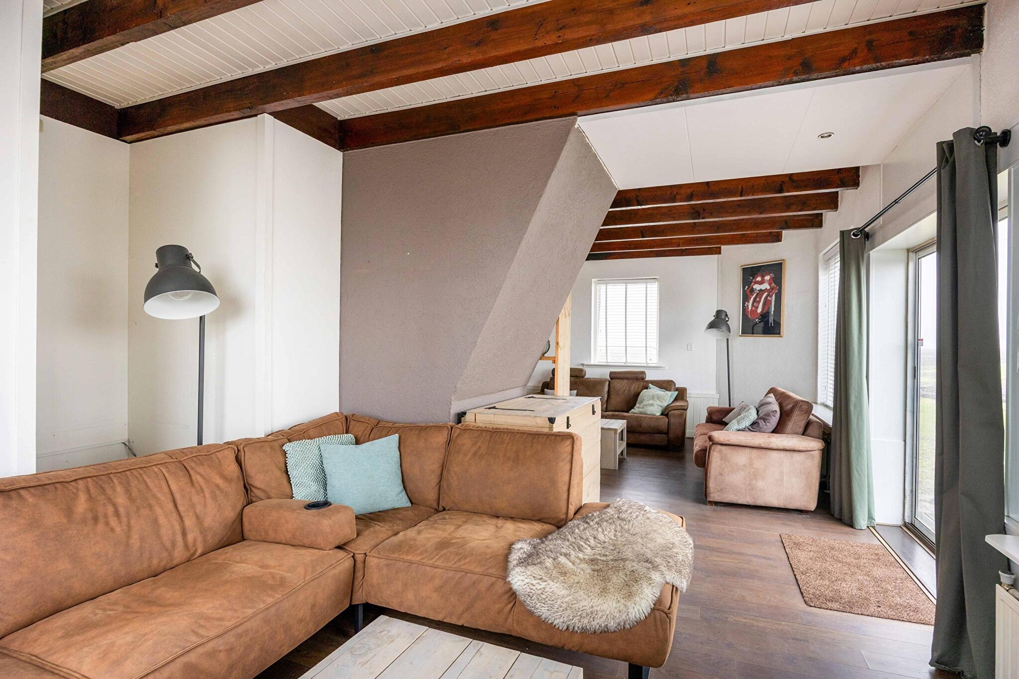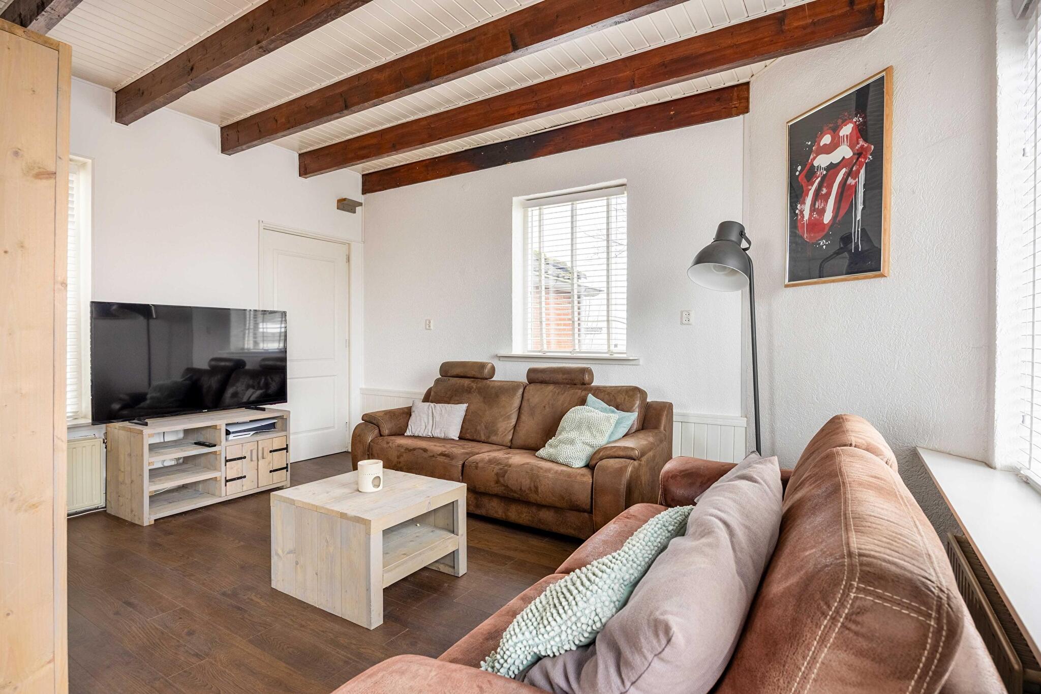 Niet alleen in de ruime woonkeuken is het goed vertoeven, ook de woonkamer biedt tal van mogelijkheden door dat deze flexibel in te delen is. Aan de voorzijde is een sfeervolle zithoek gecreëerd bij de houtkachel. Aan de achterkant is de tv-hoek gecreëerd met toegang naar de verdieping. Op de verdieping bevinden zich 3 slaapkamers, geschikt voor een gezin, thuiswerken of logees.