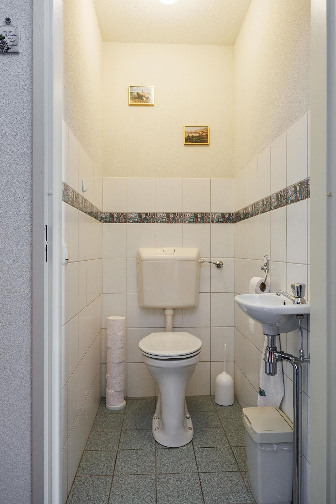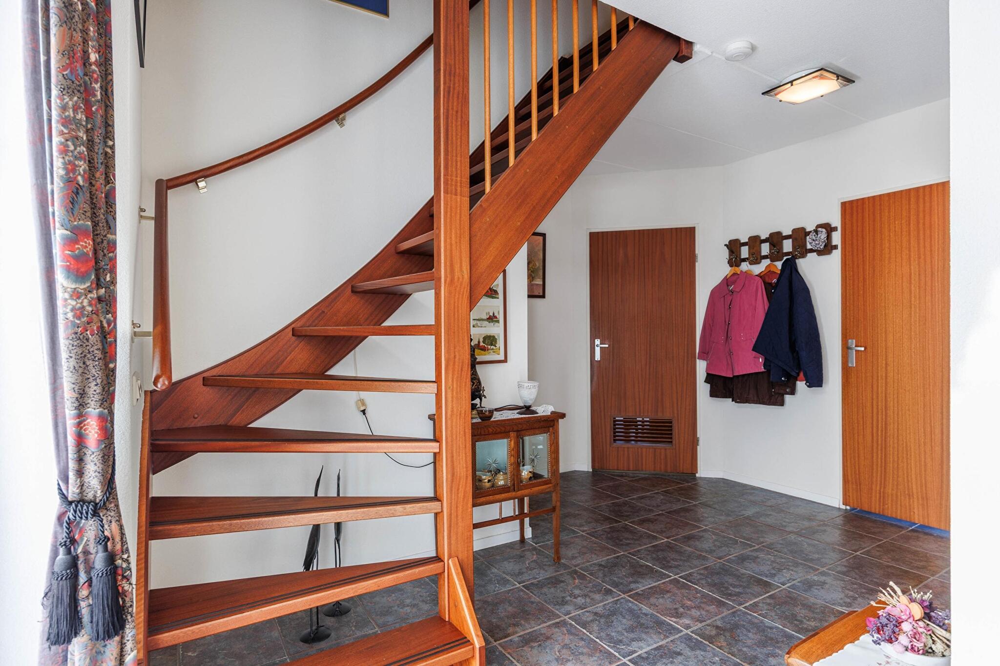 Zodra je de hal/entree binnenstapt, valt meteen op hoeveel licht en ruimte er is. Een meterkast, een nette toiletruimte voorzien van fontein, en natuurlijk de trapopgang naar de verdieping.
